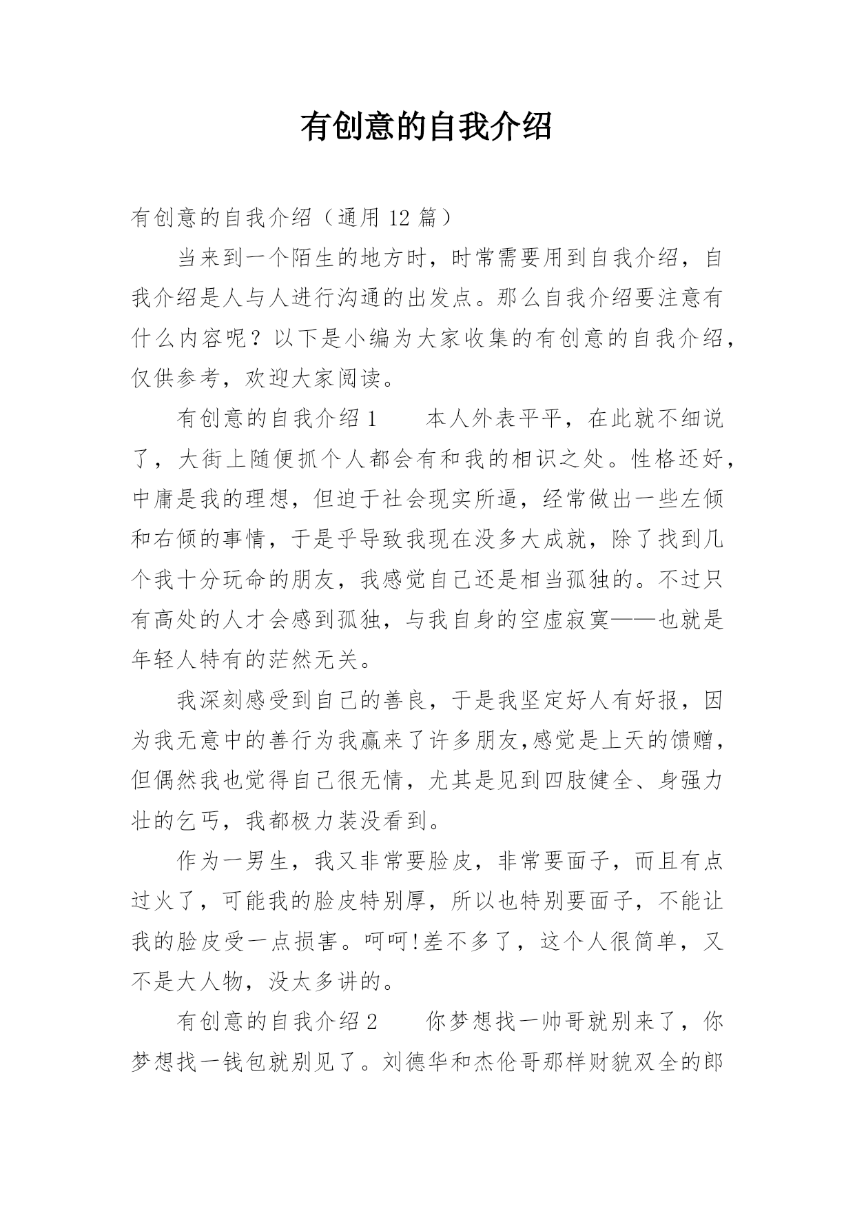 有创意的自我介绍有创意的自我介绍(通用12篇)当来到一个陌生的地方时,时常需要用到自我介绍,自我介绍是人与人进行沟通的出发点。那么自我介绍要注意有什么内容呢?以下是小编为大家收集的有创意的自我介绍,仅供参考,欢迎大家阅读。有创意的自我介绍1本人外表平平,在此就不细说了,大街上随便抓个人都会有和我的相识之处。性格还好,中庸是我的理想,但迫于社会现实所逼,经常做出一些左倾和右倾的事情,于是乎导致我现在没多大成就,除了找到几个我十分玩命的朋友,我感觉自己还是相当孤独的。不过只有高处的人才会感到孤独,与我自身的空