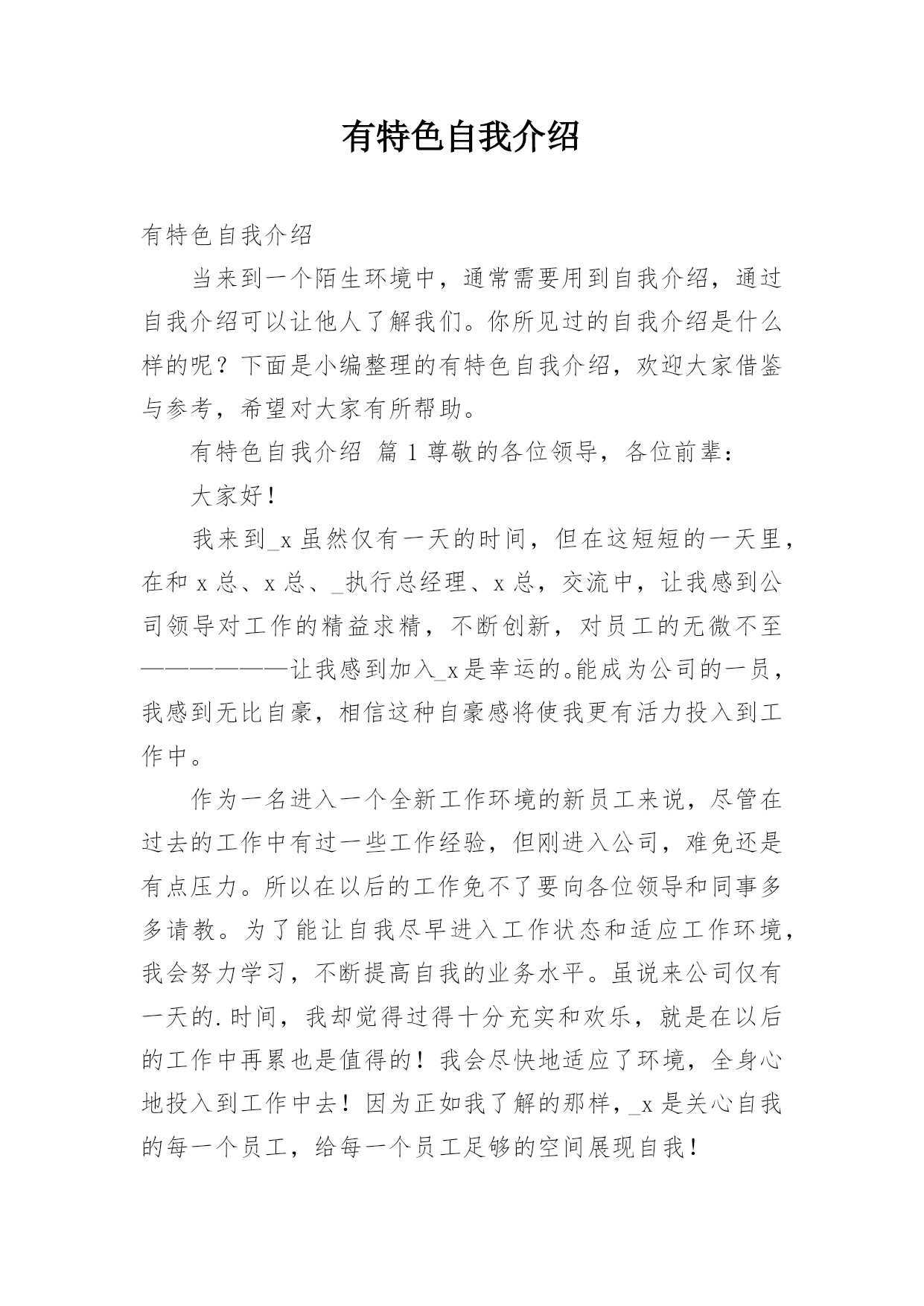 有特色自我介绍有特色自我介绍当来到一个陌生环境中,通常需要用到自我介绍,通过自我介绍可以让他人了解我们。你所见过的自我介绍是什么样的呢?下面是小编整理的有特色自我介绍,欢迎大家借鉴与参考,希望对大家有所帮助。有特色自我介绍篇1尊敬的各位领导,各位前辈:大家好!我来到_x虽然仅有一天的时间,但在这短短的一天里,在和x总、x总、_执行总经理、x总,交流中,让我感到公司领导对工作的精益求精,不断创新,对员工的无微不至——————让我感到加入_x是幸运的。能成为公司的一员,我感到无比自豪,相信这种自豪感将使我更有