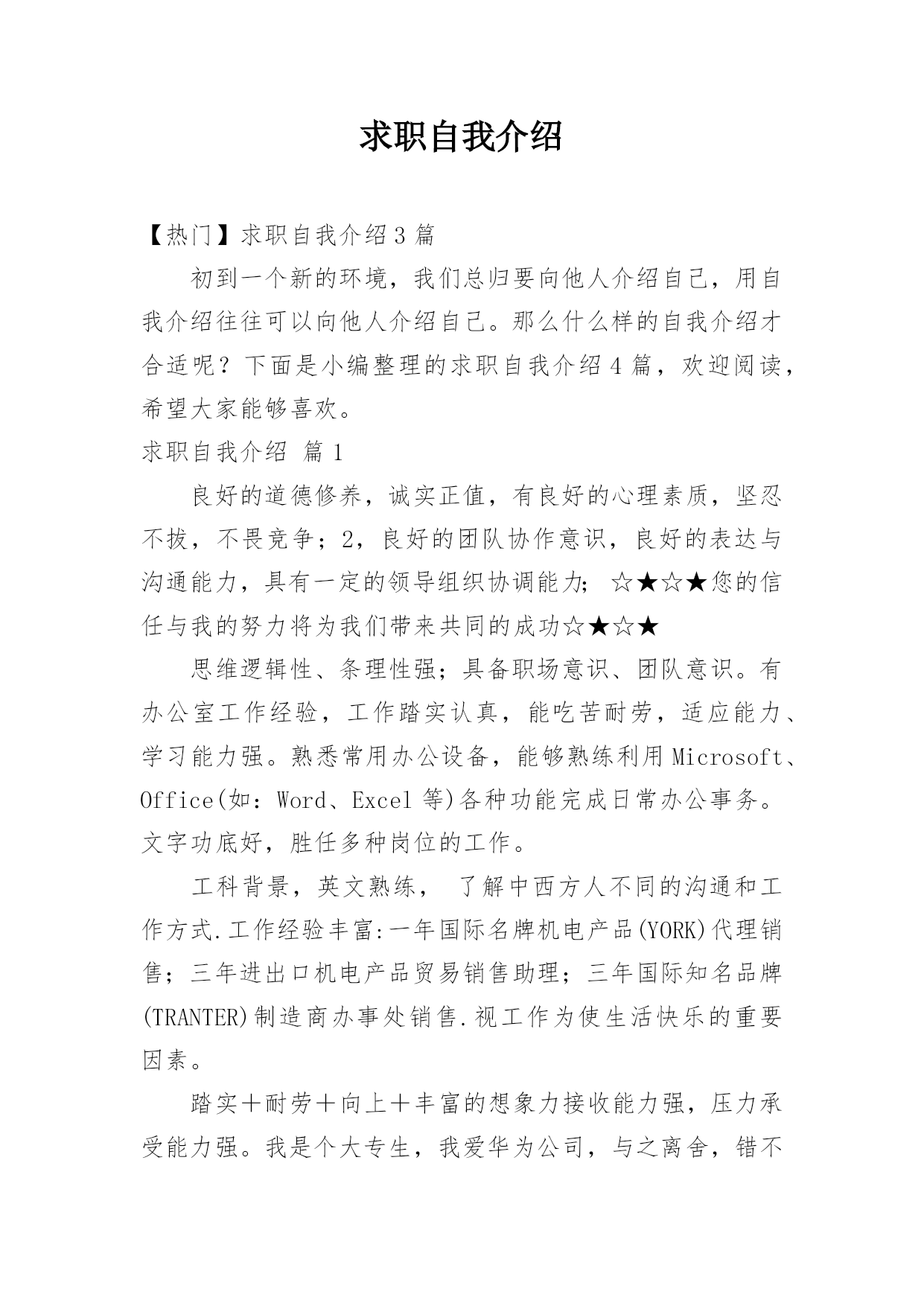 求职自我介绍【热门】求职自我介绍3篇初到一个新的环境,我们总归要向他人介绍自己,用自我介绍往往可以向他人介绍自己。那么什么样的自我介绍才合适呢?下面是小编整理的求职自我介绍4篇,欢迎阅读,希望大家能够喜欢。求职自我介绍篇1良好的道德修养,诚实正值,有良好的心理素质,坚忍不拔,不畏竞争;2,良好的团队协作意识,良好的表达与沟通能力,具有一定的领导组织协调能力;☆★☆★您的信任与我的努力将为我们带来共同的成功☆★☆★思维逻辑性、条理性强;具备职场意识、团队意识。有办公室工作经验,工作踏实认真,能吃苦耐劳,适应