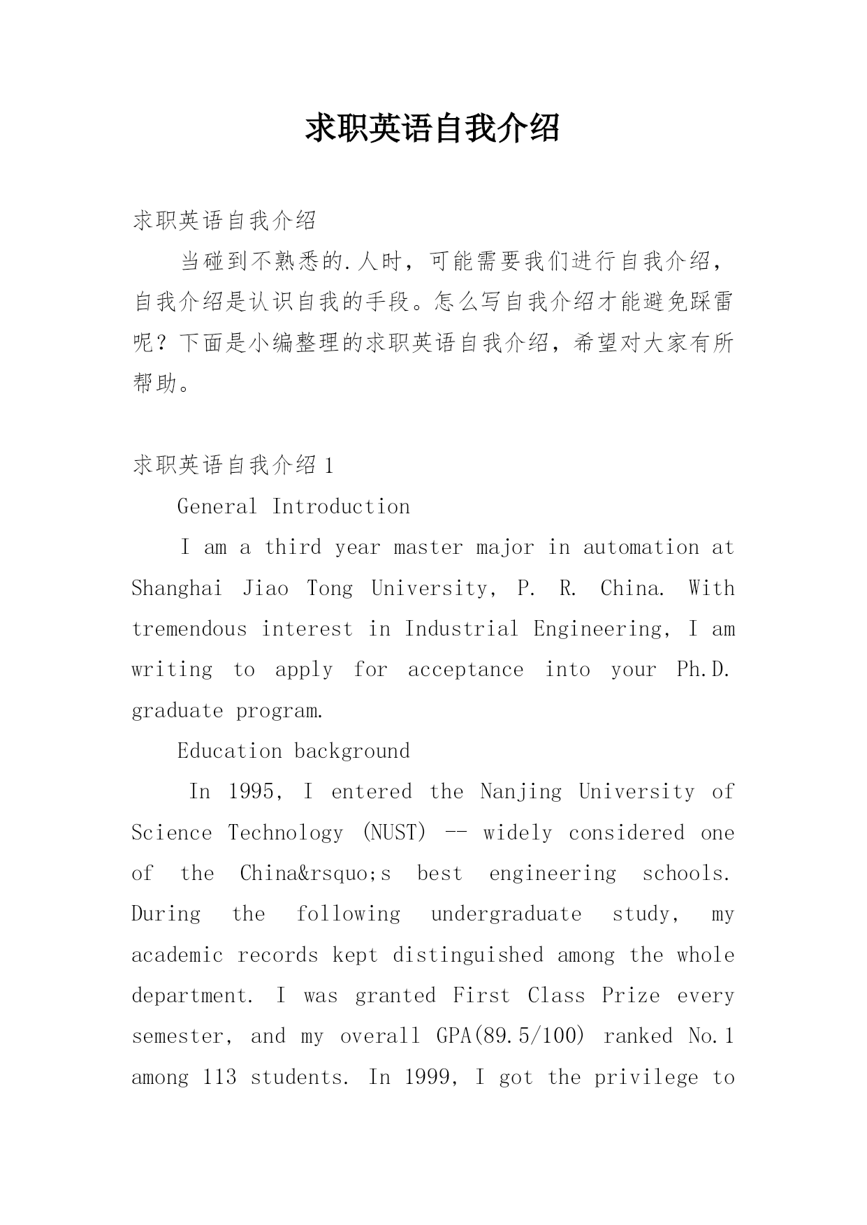 求职英语自我介绍求职英语自我介绍当碰到不熟悉的.人时,可能需要我们进行自我介绍,自我介绍是认识自我的手段。怎么写自我介绍才能避免踩雷呢?下面是小编整理的求职英语自我介绍,希望对大家有所帮助。求职英语自我介绍1GeneralIntroductionIamathirdyearmastermajorinautomationatShanghaiJiaoTongUniversity,P.R.China.WithtremendousinterestinIndustrialEngineering,Iamwritingt