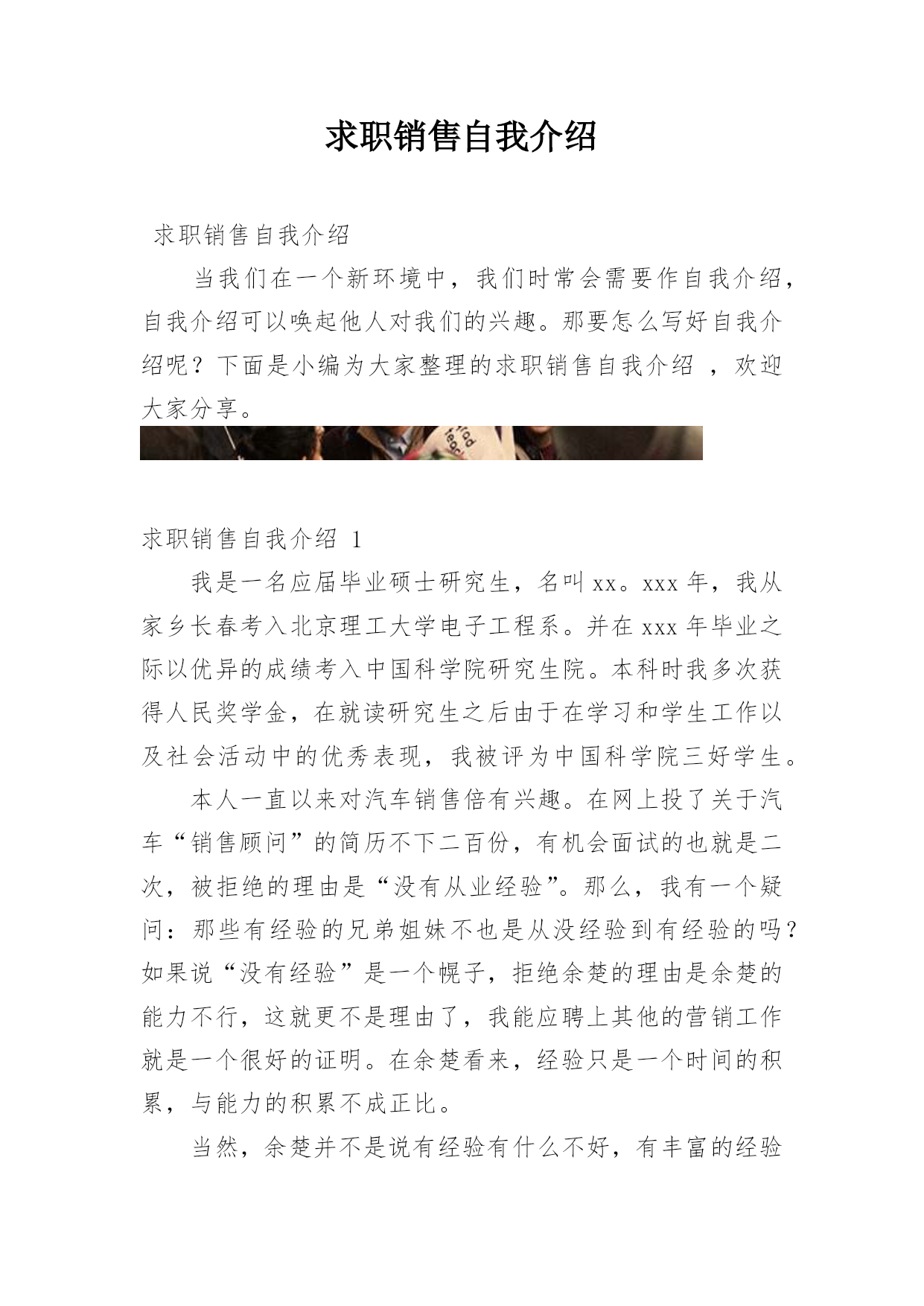 求职销售自我介绍求职销售自我介绍当我们在一个新环境中,我们时常会需要作自我介绍,自我介绍可以唤起他人对我们的兴趣。那要怎么写好自我介绍呢?下面是小编为大家整理的求职销售自我介绍,欢迎大家分享。求职销售自我介绍1我是一名应届毕业硕士研究生,名叫xx。xxx年,我从家乡长春考入北京理工大学电子工程系。并在xxx年毕业之际以优异的成绩考入中国科学院研究生院。本科时我多次获得人民奖学金,在就读研究生之后由于在学习和学生工作以及社会活动中的优秀表现,我被评为中国科学院三好学生。本人一直以来对汽车销售倍有兴趣。在网上