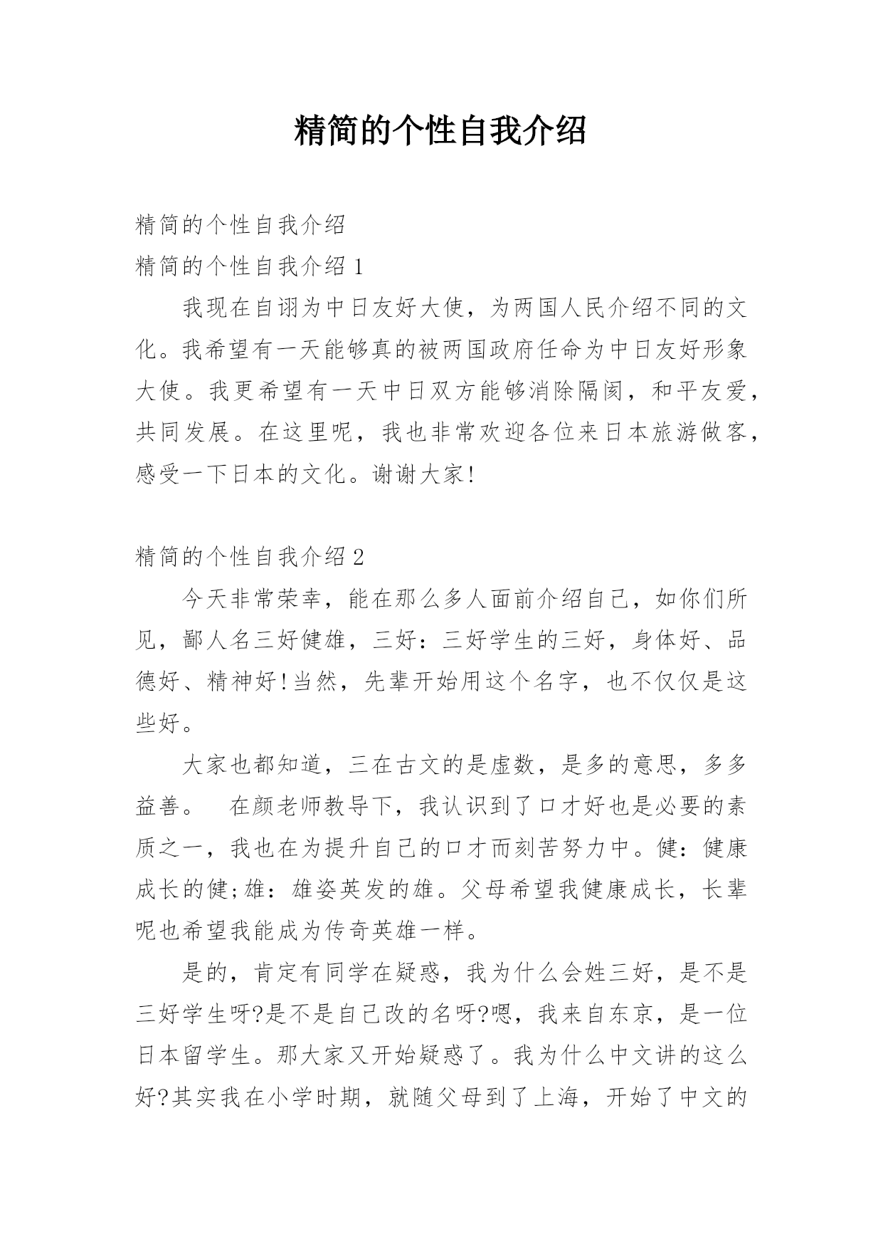 精简的个性自我介绍精简的个性自我介绍精简的个性自我介绍1我现在自诩为中日友好大使,为两国人民介绍不同的文化。我希望有一天能够真的被两国政府任命为中日友好形象大使。我更希望有一天中日双方能够消除隔阂,和平友爱,共同发展。在这里呢,我也非常欢迎各位来日本旅游做客,感受一下日本的文化。谢谢大家!精简的个性自我介绍2今天非常荣幸,能在那么多人面前介绍自己,如你们所见,鄙人名三好健雄,三好:三好学生的三好,身体好、品德好、精神好!当然,先辈开始用这个名字,也不仅仅是这些好。大家也都知道,三在古文的是虚数,是多的意思