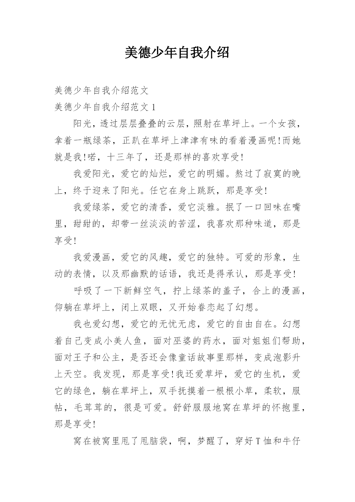 美德少年自我介绍美德少年自我介绍范文美德少年自我介绍范文1阳光,透过层层叠叠的云层,照射在草坪上。一个女孩,拿着一瓶绿茶,正趴在草坪上津津有味的看着漫画呢!而她就是我!喏,十三年了,还是那样的喜欢享受!我爱阳光,爱它的灿烂,爱它的明媚。熬过了寂寞的晚上,终于迎来了阳光。任它在身上跳跃,那是享受!我爱绿茶,爱它的清香,爱它淡雅。抿了一口回味在嘴里,甜甜的,却带一丝淡淡的苦涩,我喜欢那种味道,那是享受!我爱漫画,爱它的风趣,爱它的独特。可爱的形象,生动的表情,以及那幽默的话语,我还是得承认,那是享受!呼吸了一