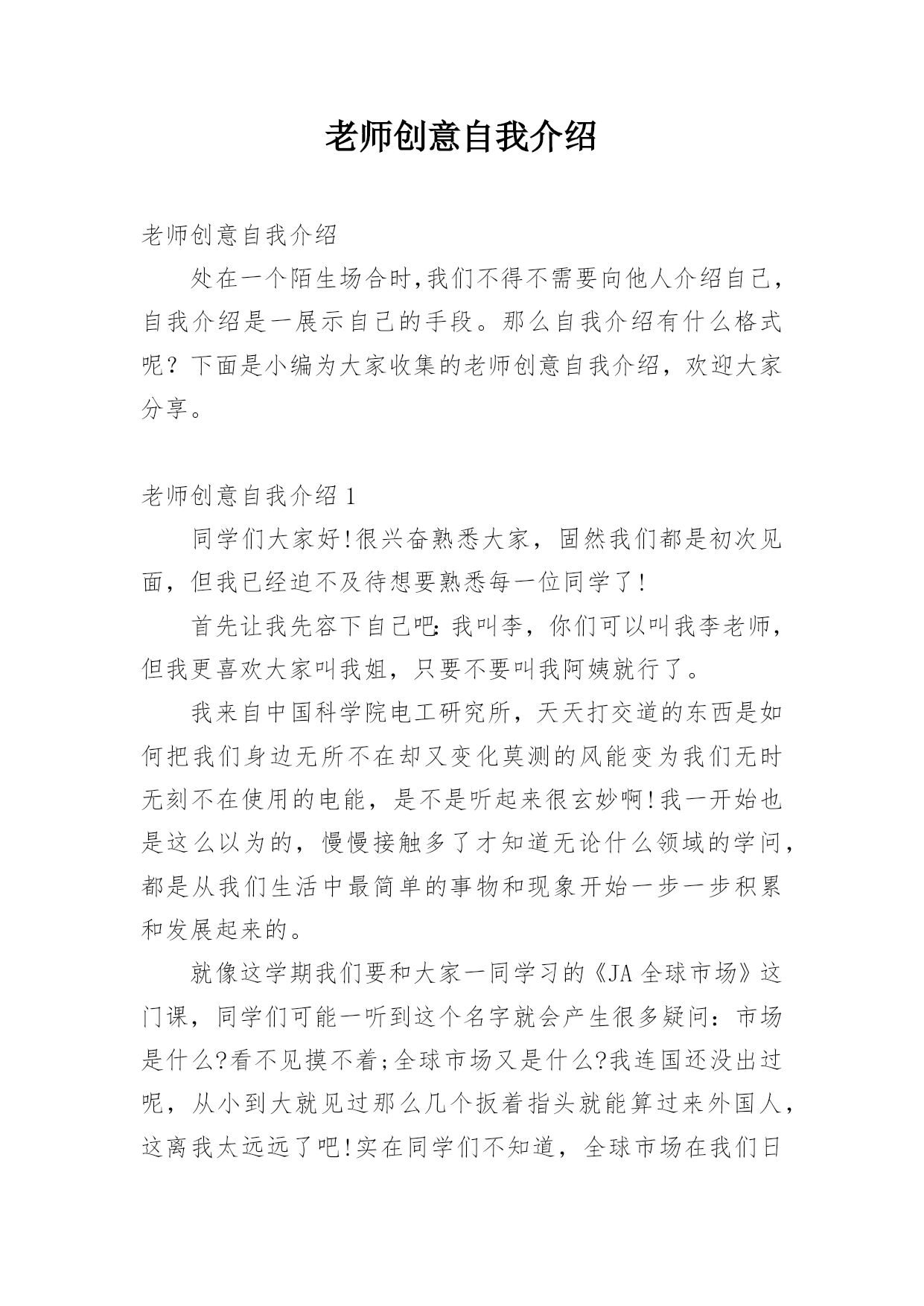 老师创意自我介绍老师创意自我介绍处在一个陌生场合时,我们不得不需要向他人介绍自己,自我介绍是一展示自己的手段。那么自我介绍有什么格式呢?下面是小编为大家收集的老师创意自我介绍,欢迎大家分享。老师创意自我介绍1同学们大家好!很兴奋熟悉大家,固然我们都是初次见面,但我已经迫不及待想要熟悉每一位同学了!首先让我先容下自己吧:我叫李,你们可以叫我李老师,但我更喜欢大家叫我姐,只要不要叫我阿姨就行了。我来自中国科学院电工研究所,天天打交道的东西是如何把我们身边无所不在却又变化莫测的风能变为我们无时无刻不在使用的电能