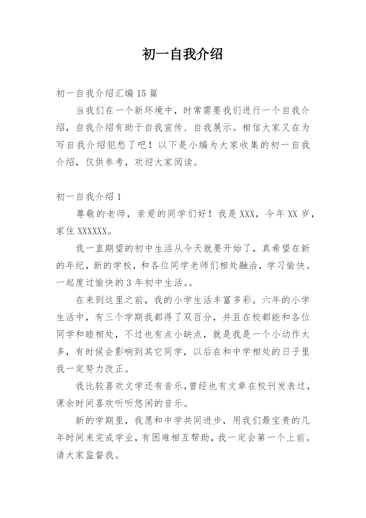 初一自我介绍初一自我介绍汇编15篇当我们在一个新环境中,时常需要我们进行一个自我介绍,自我介绍有助于自我宣传、自我展示。相信大家又在为写自我介绍犯愁了吧!以下是小编为大家收集的初一自我介绍,仅供参考,欢迎大家阅读。初一自我介绍1尊敬的老师,亲爱的同学们好!我是XXX,今年XX岁,家住XXXXXX。我一直期望的初中生活从今天就要开始了,真希望在新的年纪,新的学校,和各位同学老师们相处融洽,学习愉快。一起度过愉快的3年初中生活。。在来到这里之前,我的小学生活丰富多彩。六年的小学生活中,有三个学期我都得了双百分