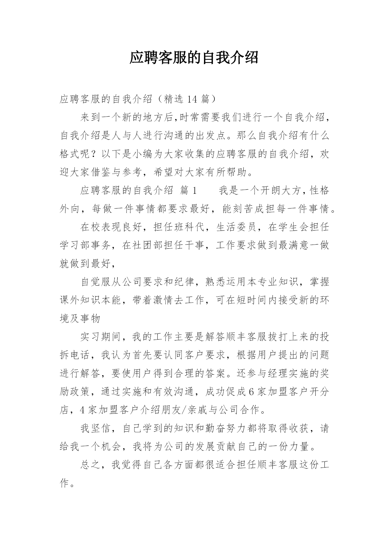 应聘客服的自我介绍应聘客服的自我介绍(精选14篇)来到一个新的地方后,时常需要我们进行一个自我介绍,自我介绍是人与人进行沟通的出发点。那么自我介绍有什么格式呢?以下是小编为大家收集的应聘客服的自我介绍,欢迎大家借鉴与参考,希望对大家有所帮助。应聘客服的自我介绍篇1我是一个开朗大方,性格外向,每做一件事情都要求最好,能刻苦成担每一件事情。在校表现良好,担任班科代,生活委员,在学生会担任学习部事务,在社团部担任干事,工作要求做到最满意一做就做到最好,自觉服从公司要求和纪律,熟悉运用本专业知识,掌握课外知识本能