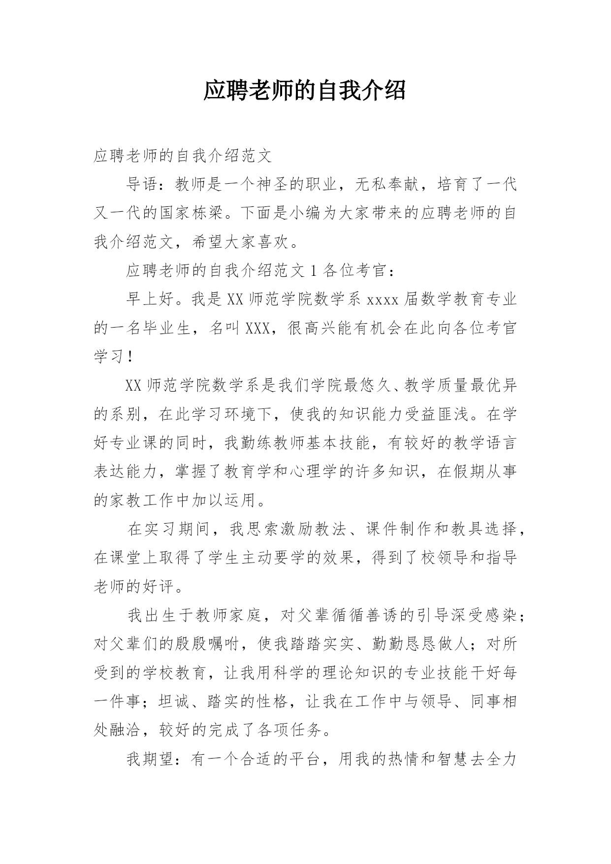 应聘老师的自我介绍应聘老师的自我介绍范文导语:教师是一个神圣的职业,无私奉献,培育了一代又一代的国家栋梁。下面是小编为大家带来的应聘老师的自我介绍范文,希望大家喜欢。应聘老师的自我介绍范文1各位考官:早上好。我是XX师范学院数学系xxxx届数学教育专业的一名毕业生,名叫XXX,很高兴能有机会在此向各位考官学习!XX师范学院数学系是我们学院最悠久、教学质量最优异的系别,在此学习环境下,使我的知识能力受益匪浅。在学好专业课的同时,我勤练教师基本技能,有较好的教学语言表达能力,掌握了教育学和心理学的许多知识,在