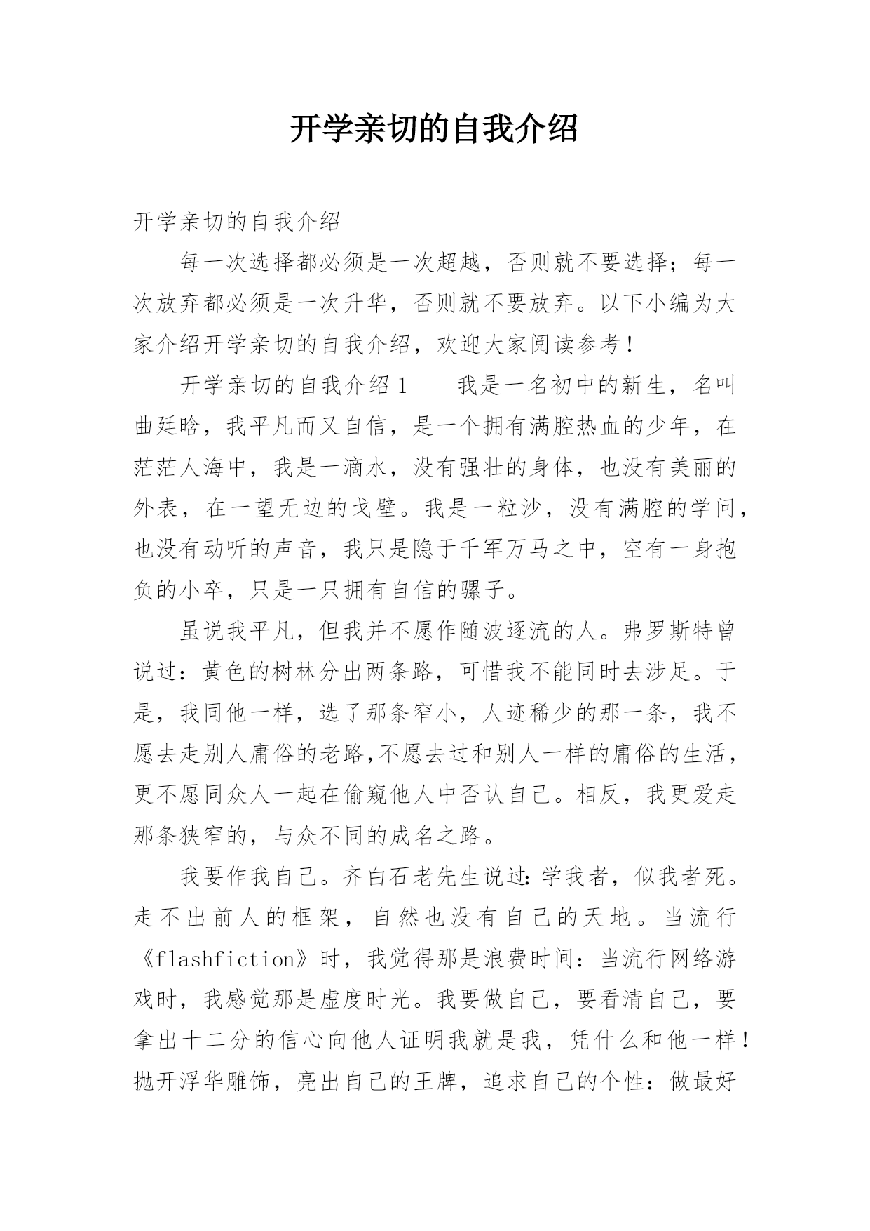 开学亲切的自我介绍开学亲切的自我介绍每一次选择都必须是一次超越,否则就不要选择;每一次放弃都必须是一次升华,否则就不要放弃。以下小编为大家介绍开学亲切的自我介绍,欢迎大家阅读参考!开学亲切的自我介绍1我是一名初中的新生,名叫曲廷晗,我平凡而又自信,是一个拥有满腔热血的少年,在茫茫人海中,我是一滴水,没有强壮的身体,也没有美丽的外表,在一望无边的戈壁。我是一粒沙,没有满腔的学问,也没有动听的声音,我只是隐于千军万马之中,空有一身抱负的小卒,只是一只拥有自信的骡子。虽说我平凡,但我并不愿作随波逐流的人。弗罗斯