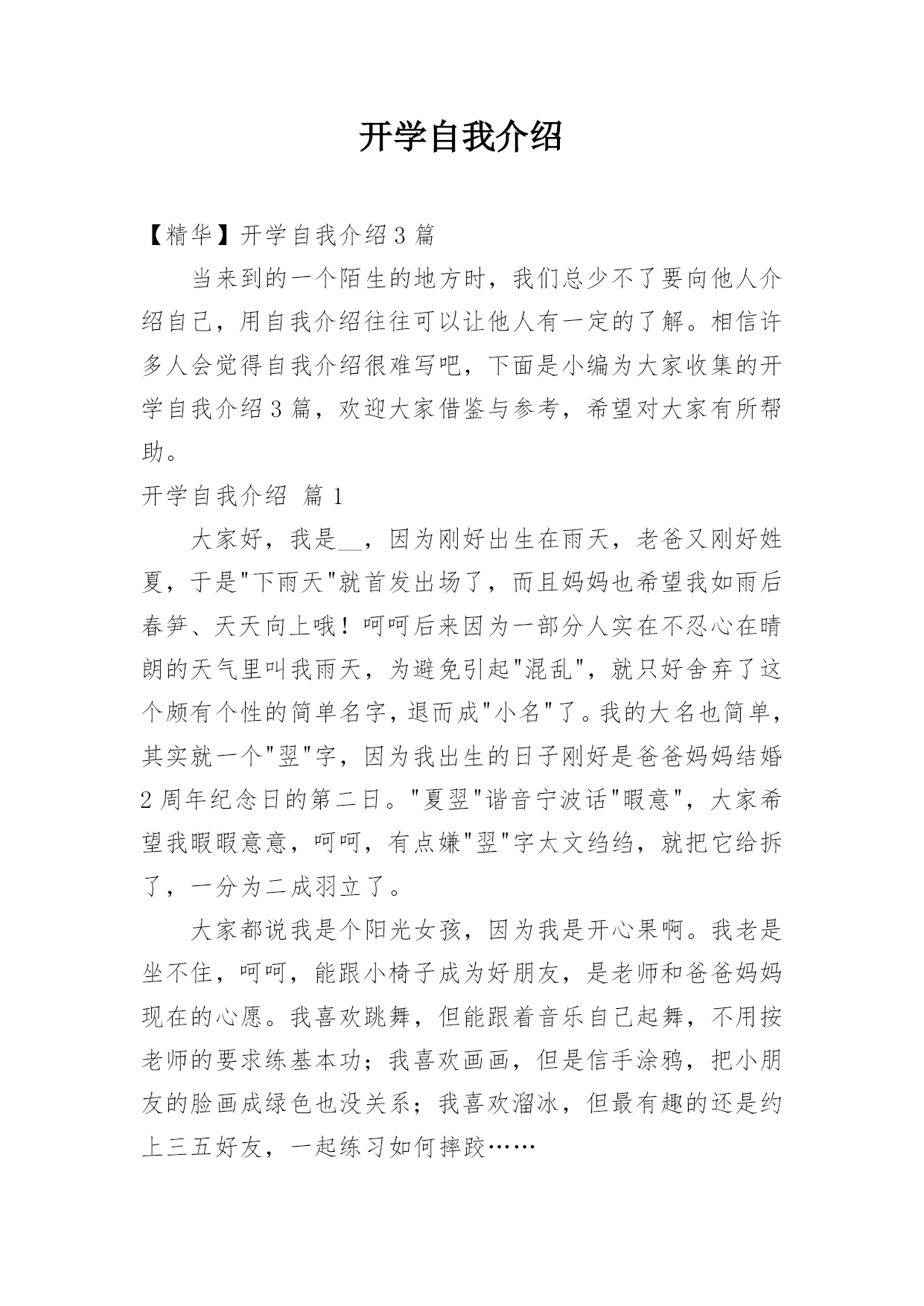 开学自我介绍【精华】开学自我介绍3篇当来到的一个陌生的地方时,我们总少不了要向他人介绍自己,用自我介绍往往可以让他人有一定的了解。相信许多人会觉得自我介绍很难写吧,下面是小编为大家收集的开学自我介绍3篇,欢迎大家借鉴与参考,希望对大家有所帮助。开学自我介绍篇1大家好,我是__,因为刚好出生在雨天,老爸又刚好姓夏,于是"下雨天"就首发出场了,而且妈妈也希望我如雨后春笋、天天向上哦!呵呵后来因为一部分人实在不忍心在晴朗的天气里叫我雨天,为避免引起"混乱",就只好舍弃了这个颇有个性的简单名字,退而成"小名"了。