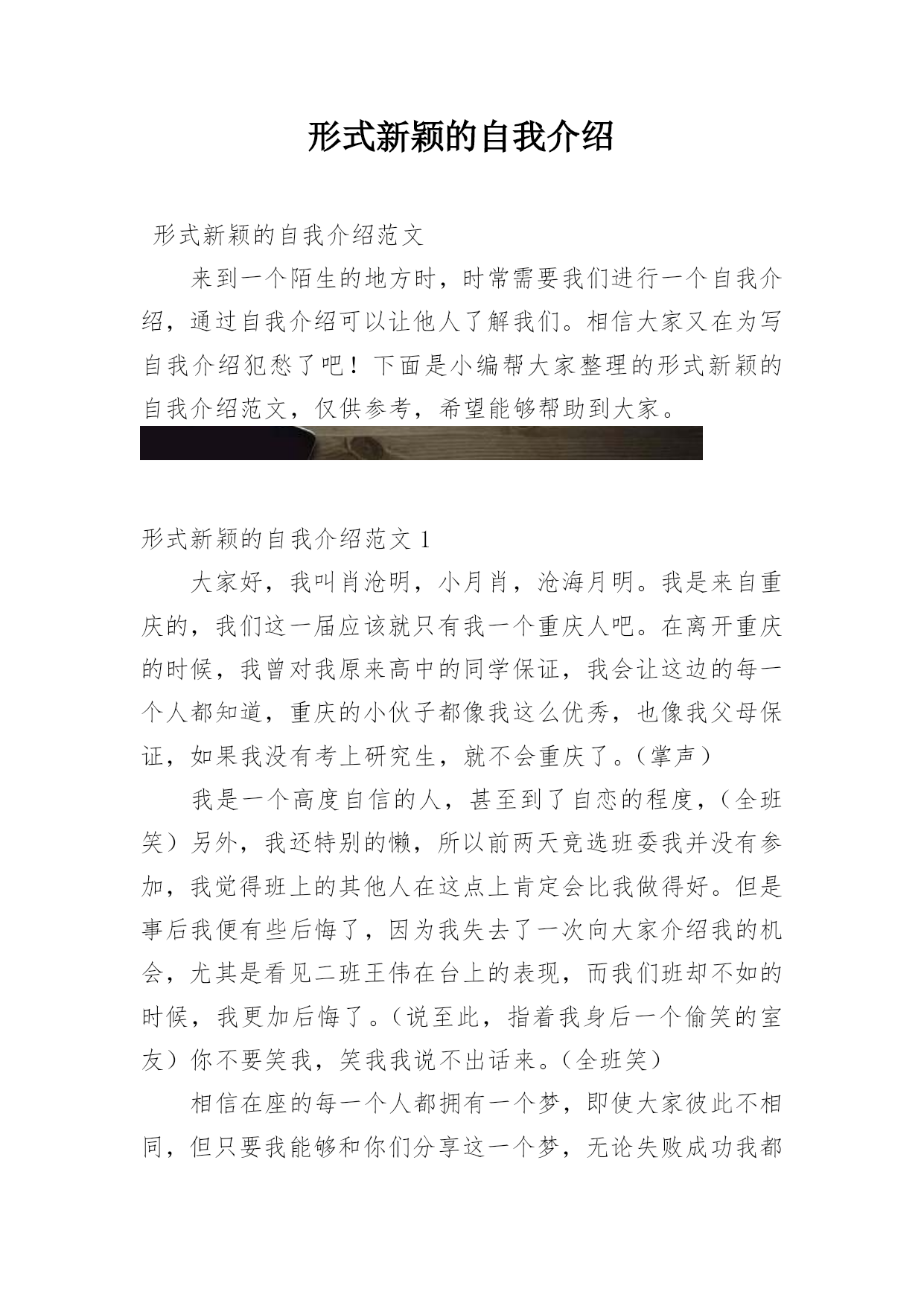 形式新颖的自我介绍形式新颖的自我介绍范文来到一个陌生的地方时,时常需要我们进行一个自我介绍,通过自我介绍可以让他人了解我们。相信大家又在为写自我介绍犯愁了吧!下面是小编帮大家整理的形式新颖的自我介绍范文,仅供参考,希望能够帮助到大家。形式新颖的自我介绍范文1大家好,我叫肖沧明,小月肖,沧海月明。我是来自重庆的,我们这一届应该就只有我一个重庆人吧。在离开重庆的时候,我曾对我原来高中的同学保证,我会让这边的每一个人都知道,重庆的小伙子都像我这么优秀,也像我父母保证,如果我没有考上研究生,就不会重庆了。(掌声)