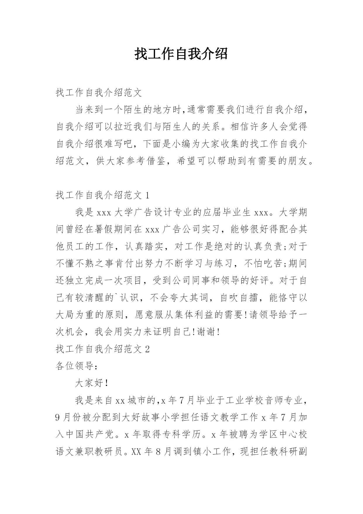 找工作自我介绍找工作自我介绍范文当来到一个陌生的地方时,通常需要我们进行自我介绍,自我介绍可以拉近我们与陌生人的关系。相信许多人会觉得自我介绍很难写吧,下面是小编为大家收集的找工作自我介绍范文,供大家参考借鉴,希望可以帮助到有需要的朋友。找工作自我介绍范文1我是xxx大学广告设计专业的应届毕业生xxx。大学期间曾经在暑假期间在xxx广告公司实习,能够很好得配合其他员工的工作,认真踏实,对工作是绝对的认真负责;对于不懂不熟之事肯付出努力不断学习与练习,不怕吃苦;期间还独立完成一次项目,受到公司同事和领导的好