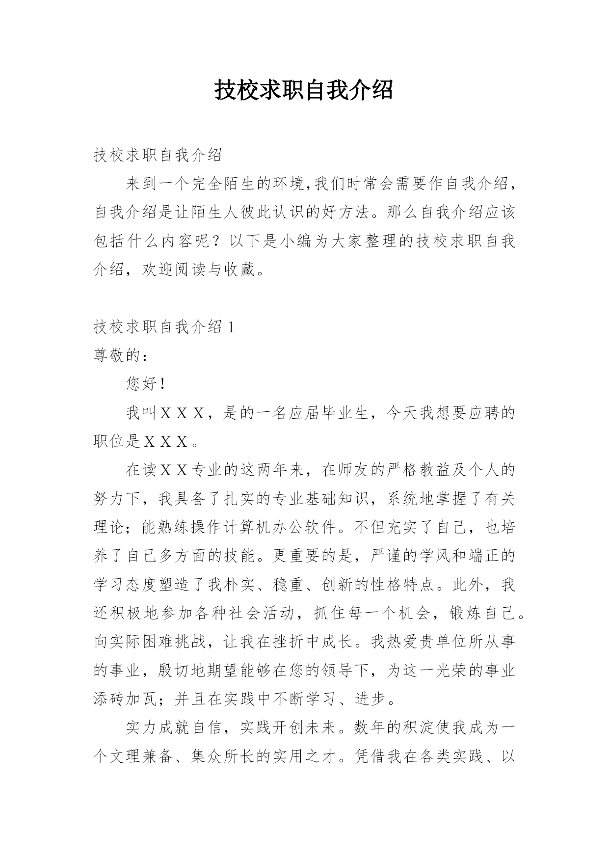 技校求职自我介绍技校求职自我介绍来到一个完全陌生的环境,我们时常会需要作自我介绍,自我介绍是让陌生人彼此认识的好方法。那么自我介绍应该包括什么内容呢?以下是小编为大家整理的技校求职自我介绍,欢迎阅读与收藏。技校求职自我介绍1尊敬的:您好!我叫XXX,是的一名应届毕业生,今天我想要应聘的职位是XXX。在读XX专业的这两年来,在师友的严格教益及个人的努力下,我具备了扎实的专业基础知识,系统地掌握了有关理论;能熟练操作计算机办公软件。不但充实了自己,也培养了自己多方面的技能。更重要的是,严谨的学风和端正的学习态