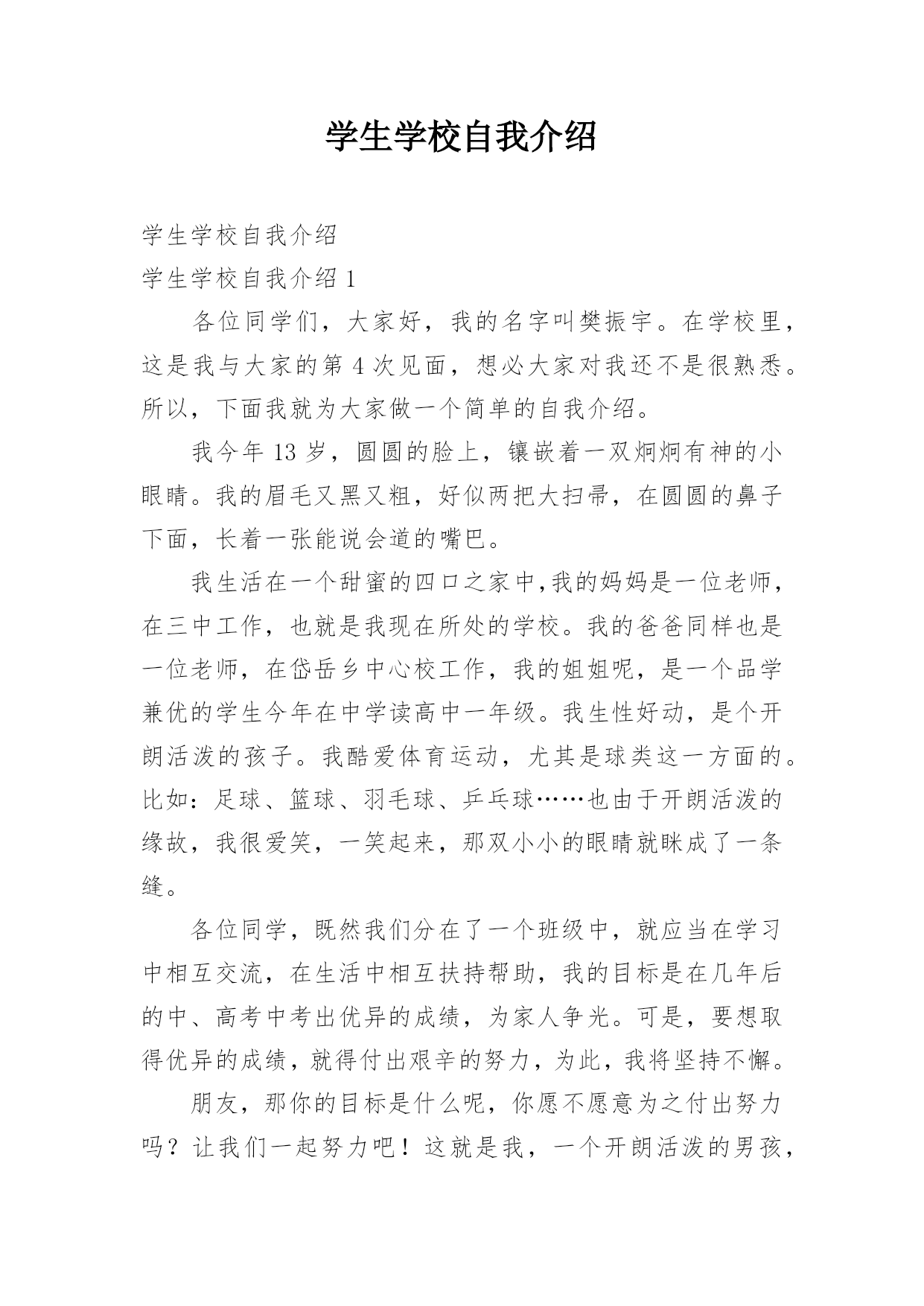 学生学校自我介绍学生学校自我介绍学生学校自我介绍1各位同学们,大家好,我的名字叫樊振宇。在学校里,这是我与大家的第4次见面,想必大家对我还不是很熟悉。所以,下面我就为大家做一个简单的自我介绍。我今年13岁,圆圆的脸上,镶嵌着一双炯炯有神的小眼睛。我的眉毛又黑又粗,好似两把大扫帚,在圆圆的鼻子下面,长着一张能说会道的嘴巴。我生活在一个甜蜜的四口之家中,我的妈妈是一位老师,在三中工作,也就是我现在所处的学校。我的爸爸同样也是一位老师,在岱岳乡中心校工作,我的姐姐呢,是一个品学兼优的学生今年在中学读高中一年级。