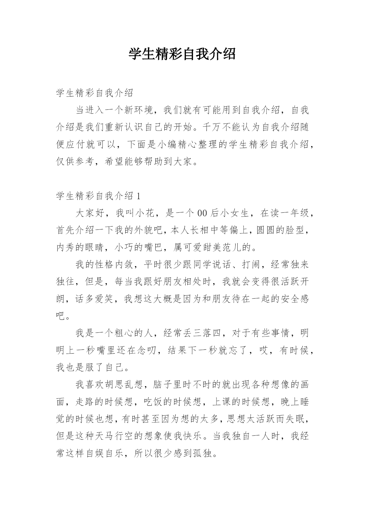 学生精彩自我介绍学生精彩自我介绍当进入一个新环境,我们就有可能用到自我介绍,自我介绍是我们重新认识自己的开始。千万不能认为自我介绍随便应付就可以,下面是小编精心整理的学生精彩自我介绍,仅供参考,希望能够帮助到大家。学生精彩自我介绍1大家好,我叫小花,是一个00后小女生,在读一年级,首先介绍一下我的外貌吧,本人长相中等偏上,圆圆的脸型,内秀的眼睛,小巧的嘴巴,属可爱甜美范儿的。我的性格内敛,平时很少跟同学说话、打闹,经常独来独往,但是,每当我跟好朋友相处时,我就会变得很活跃开朗,话多爱笑,我想这大概是因为和