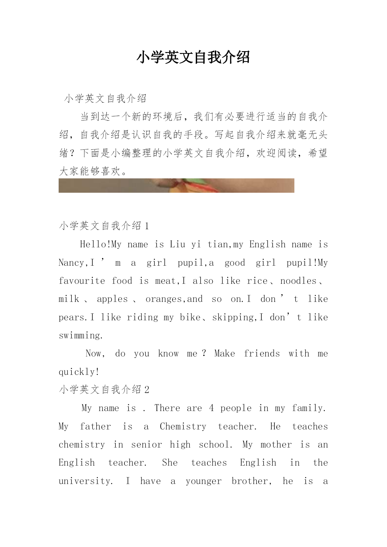 小学英文自我介绍小学英文自我介绍当到达一个新的环境后,我们有必要进行适当的自我介绍,自我介绍是认识自我的手段。写起自我介绍来就毫无头绪?下面是小编整理的小学英文自我介绍,欢迎阅读,希望大家能够喜欢。小学英文自我介绍1Hello!MynameisLiuyitian,myEnglishnameisNancy,I’magirlpupil,agoodgirlpupil!Myfavouritefoodismeat,Ialsolikerice、noodles、milk、apples、oranges,andsoon.I
