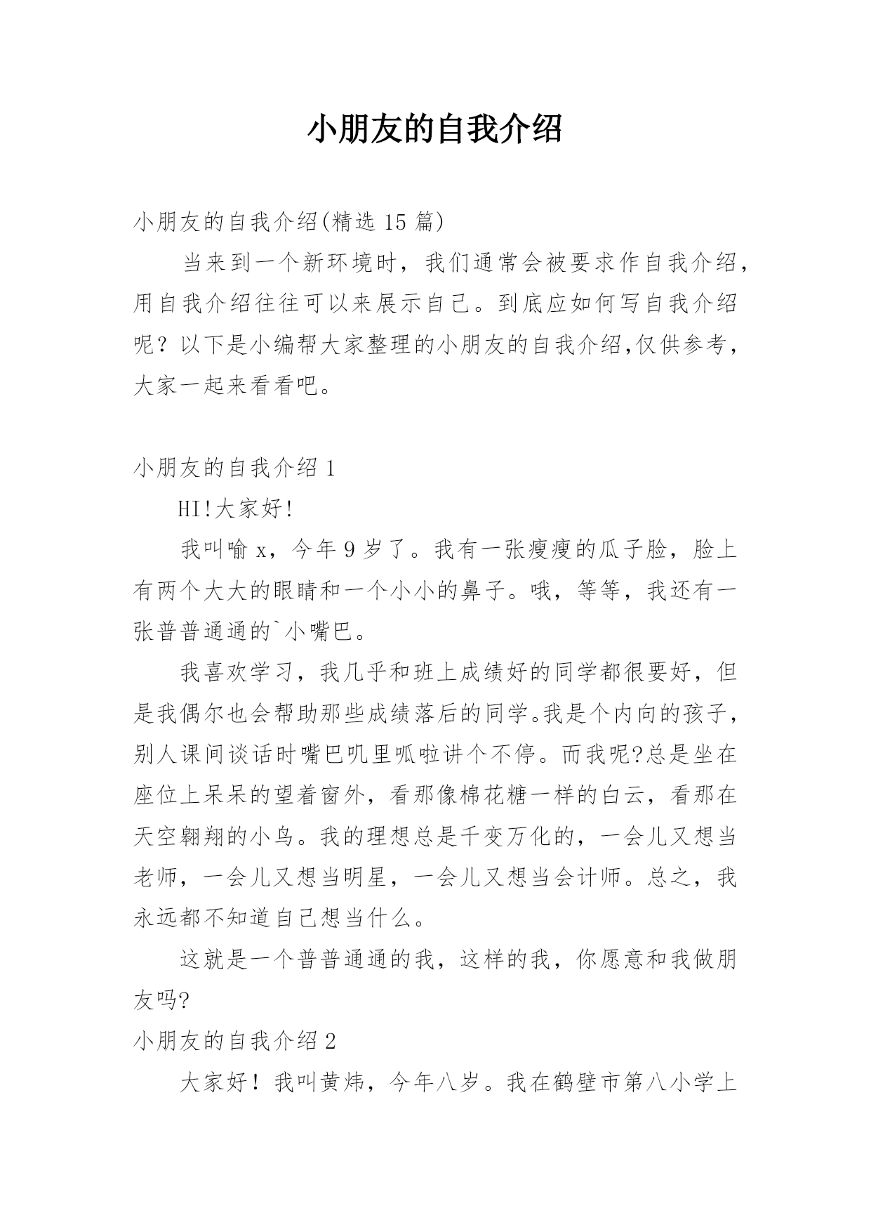 小朋友的自我介绍小朋友的自我介绍(精选15篇)当来到一个新环境时,我们通常会被要求作自我介绍,用自我介绍往往可以来展示自己。到底应如何写自我介绍呢?以下是小编帮大家整理的小朋友的自我介绍,仅供参考,大家一起来看看吧。小朋友的自我介绍1HI!大家好!我叫喻x,今年9岁了。我有一张瘦瘦的瓜子脸,脸上有两个大大的眼睛和一个小小的鼻子。哦,等等,我还有一张普普通通的`小嘴巴。我喜欢学习,我几乎和班上成绩好的同学都很要好,但是我偶尔也会帮助那些成绩落后的同学。我是个内向的孩子,别人课间谈话时嘴巴叽里呱啦讲个不停。而