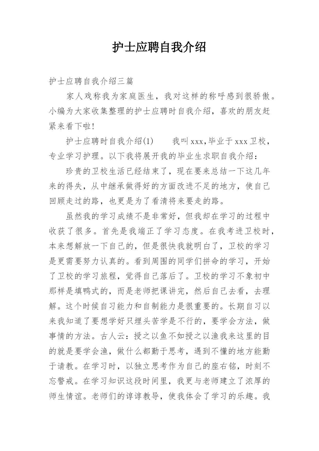 护士应聘自我介绍护士应聘自我介绍三篇家人戏称我为家庭医生,我对这样的称呼感到很骄傲。小编为大家收集整理的护士应聘时自我介绍,喜欢的朋友赶紧来看下啦!护士应聘时自我介绍(1)我叫xxx,毕业于xxx卫校,专业学习护理。以下我将展开我的毕业生求职自我介绍:珍贵的卫校生活已经结束了,现在要来总结一下这几年来的得失,从中继承做得好的方面改进不足的地方,使自己回顾走过的路,也更是为了看清将来要走的路。虽然我的学习成绩不是非常好,但我却在学习的过程中收获了很多。首先是我端正了学习态度。在我考进卫校时,本来想解放一下自