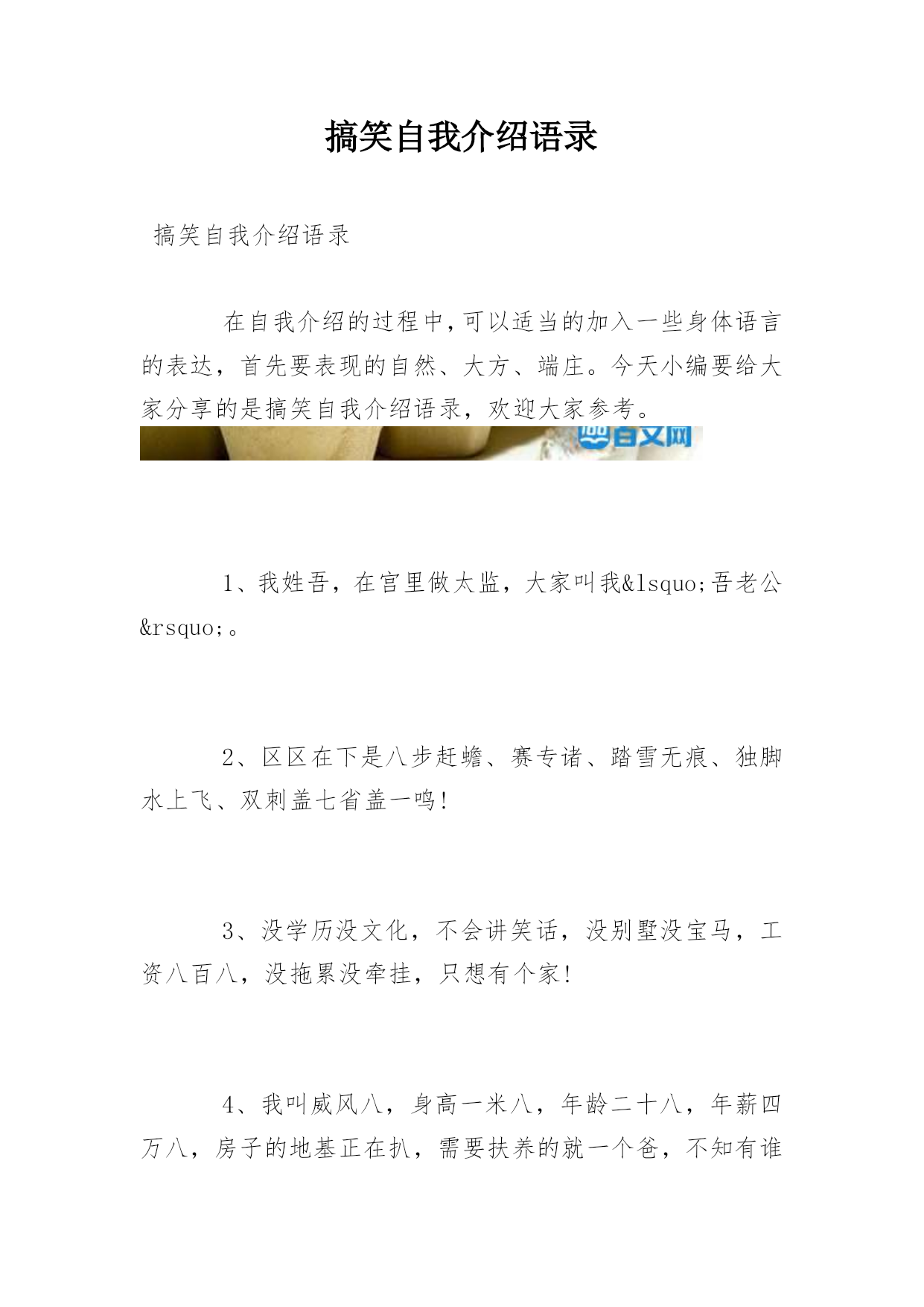 搞笑自我介绍语录搞笑自我介绍语录在自我介绍的过程中,可以适当的加入一些身体语言的表达,首先要表现的自然、大方、端庄。今天小编要给大家分享的是搞笑自我介绍语录,欢迎大家参考。1、我姓吾,在宫里做太监,大家叫我‘吾老公’。2、区区在下是八步赶蟾、赛专诸、踏雪无痕、独脚水上飞、双刺盖七省盖一鸣!3、没学历没文化,不会讲笑话,没别墅没宝马,工资八百八,没拖累没牵挂,只想有个家!4、我叫威风八,身高一米八,年龄二十八,年薪四万八,房子的地基正在扒,需要扶养的就一个爸,不知有谁愿意嫁。5、我就