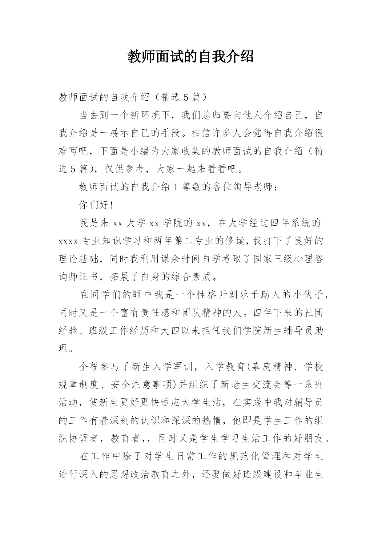 教师面试的自我介绍教师面试的自我介绍(精选5篇)当去到一个新环境下,我们总归要向他人介绍自己,自我介绍是一展示自己的手段。相信许多人会觉得自我介绍很难写吧,下面是小编为大家收集的教师面试的自我介绍(精选5篇),仅供参考,大家一起来看看吧。教师面试的自我介绍1尊敬的各位领导老师:你们好!我是来xx大学xx学院的xx,在大学经过四年系统的xxxx专业知识学习和两年第二专业的修读,我打下了良好的理论基础,同时我利用课余时间自学考取了国家三级心理咨询师证书,拓展了自身的综合素质。在同学们的眼中我是一个性格开朗乐于