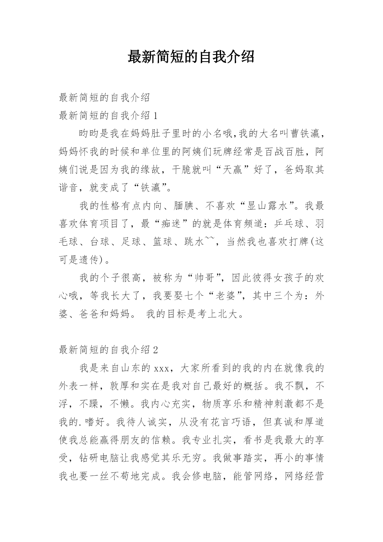 最新简短的自我介绍最新简短的自我介绍最新简短的自我介绍1昀昀是我在妈妈肚子里时的小名哦,我的大名叫曹铁瀛,妈妈怀我的时候和单位里的阿姨们玩牌经常是百战百胜,阿姨们说是因为我的缘故,干脆就叫“天赢”好了,爸妈取其谐音,就变成了“铁瀛”。我的性格有点内向、腼腆、不喜欢“显山露水”。我最喜欢体育项目了,最“痴迷”的就是体育频道:乒乓球、羽毛球、台球、足球、篮球、跳水~~,当然我也喜欢打牌(这可是遗传)。我的个子很高,被称为“帅哥”,因此彼得女孩子的欢心哦,等我长大了,我要娶七个“老婆”,其中三个为:外婆、爸爸和