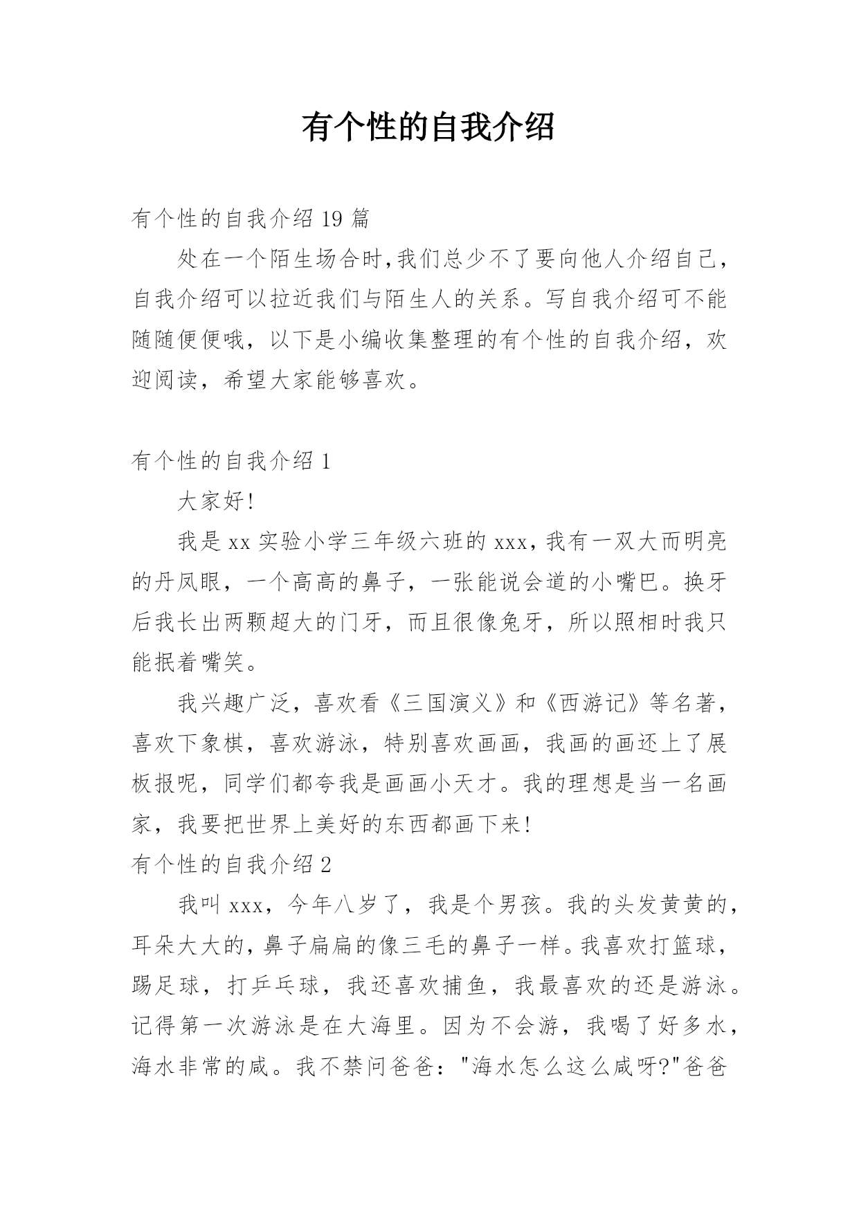 有个性的自我介绍有个性的自我介绍19篇处在一个陌生场合时,我们总少不了要向他人介绍自己,自我介绍可以拉近我们与陌生人的关系。写自我介绍可不能随随便便哦,以下是小编收集整理的有个性的自我介绍,欢迎阅读,希望大家能够喜欢。有个性的自我介绍1大家好!我是xx实验小学三年级六班的xxx,我有一双大而明亮的丹凤眼,一个高高的鼻子,一张能说会道的小嘴巴。换牙后我长出两颗超大的门牙,而且很像兔牙,所以照相时我只能抿着嘴笑。我兴趣广泛,喜欢看《三国演义》和《西游记》等名著,喜欢下象棋,喜欢游泳,特别喜欢画画,我画的画还上