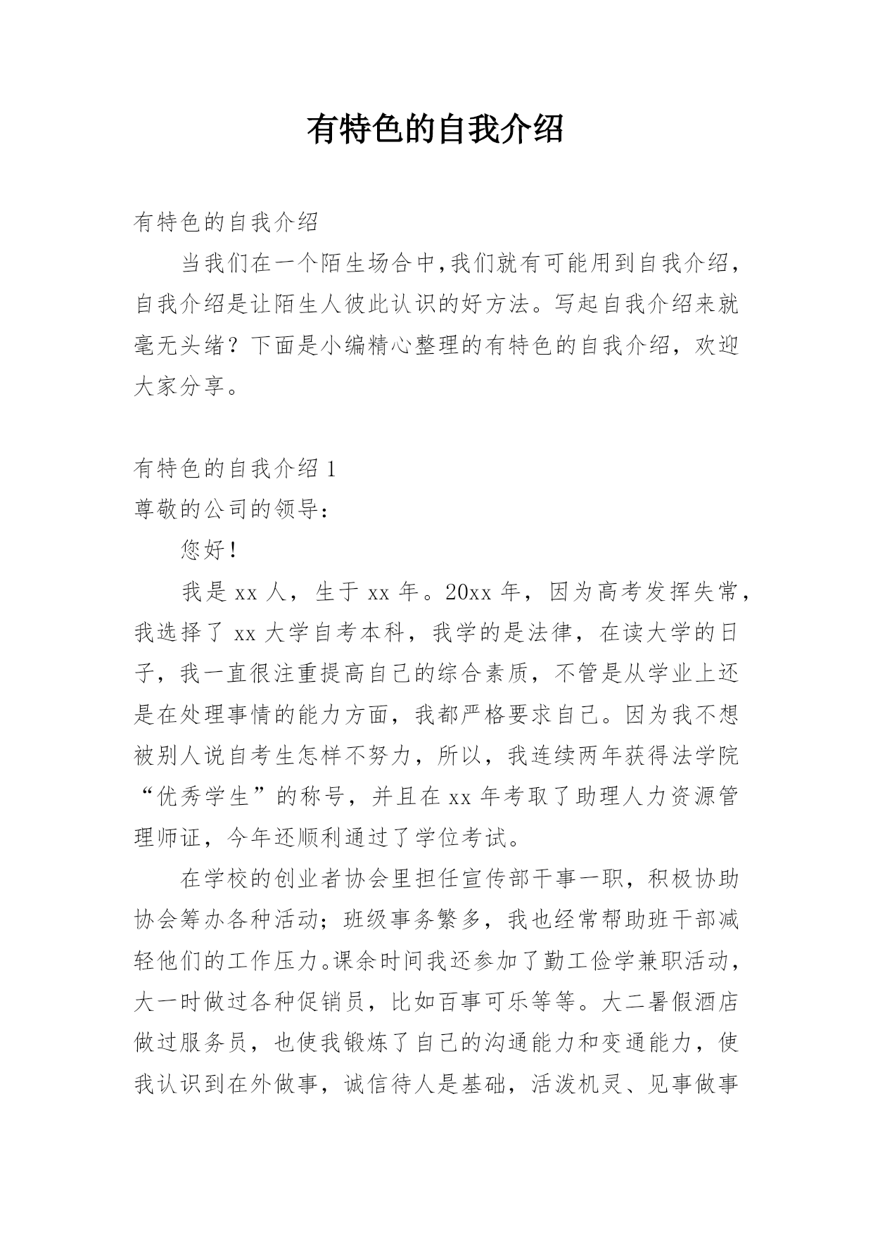 有特色的自我介绍有特色的自我介绍当我们在一个陌生场合中,我们就有可能用到自我介绍,自我介绍是让陌生人彼此认识的好方法。写起自我介绍来就毫无头绪?下面是小编精心整理的有特色的自我介绍,欢迎大家分享。有特色的自我介绍1尊敬的公司的领导:您好!我是xx人,生于xx年。20xx年,因为高考发挥失常,我选择了xx大学自考本科,我学的是法律,在读大学的日子,我一直很注重提高自己的综合素质,不管是从学业上还是在处理事情的能力方面,我都严格要求自己。因为我不想被别人说自考生怎样不努力,所以,我连续两年获得法学院“优秀学生