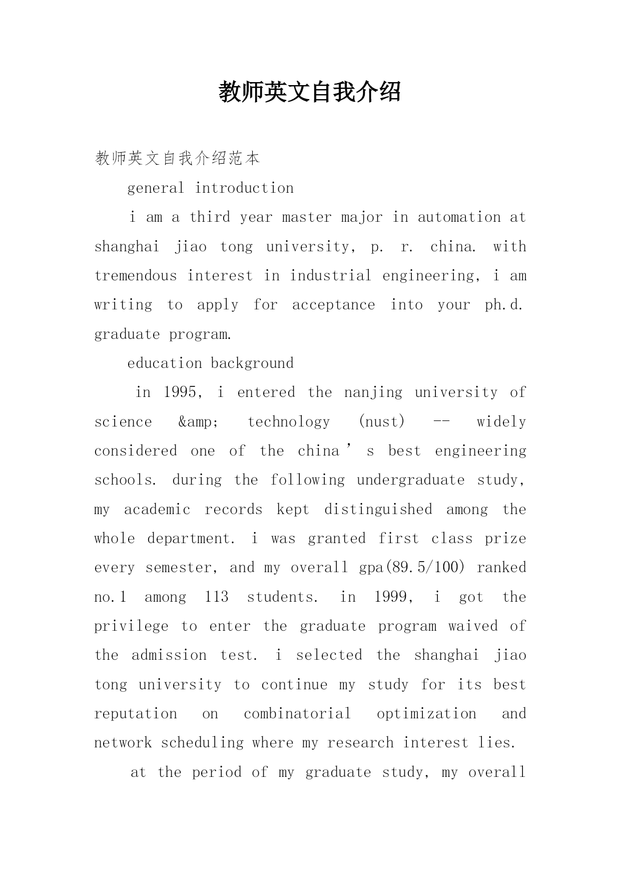教师英文自我介绍教师英文自我介绍范本generalintroductioniamathirdyearmastermajorinautomationatshanghaijiaotonguniversity,p.r.china.withtremendousinterestinindustrialengineering,iamwritingtoapplyforacceptanceintoyourph.d.graduateprogram.educationbackgroundin1995,ienteredthen