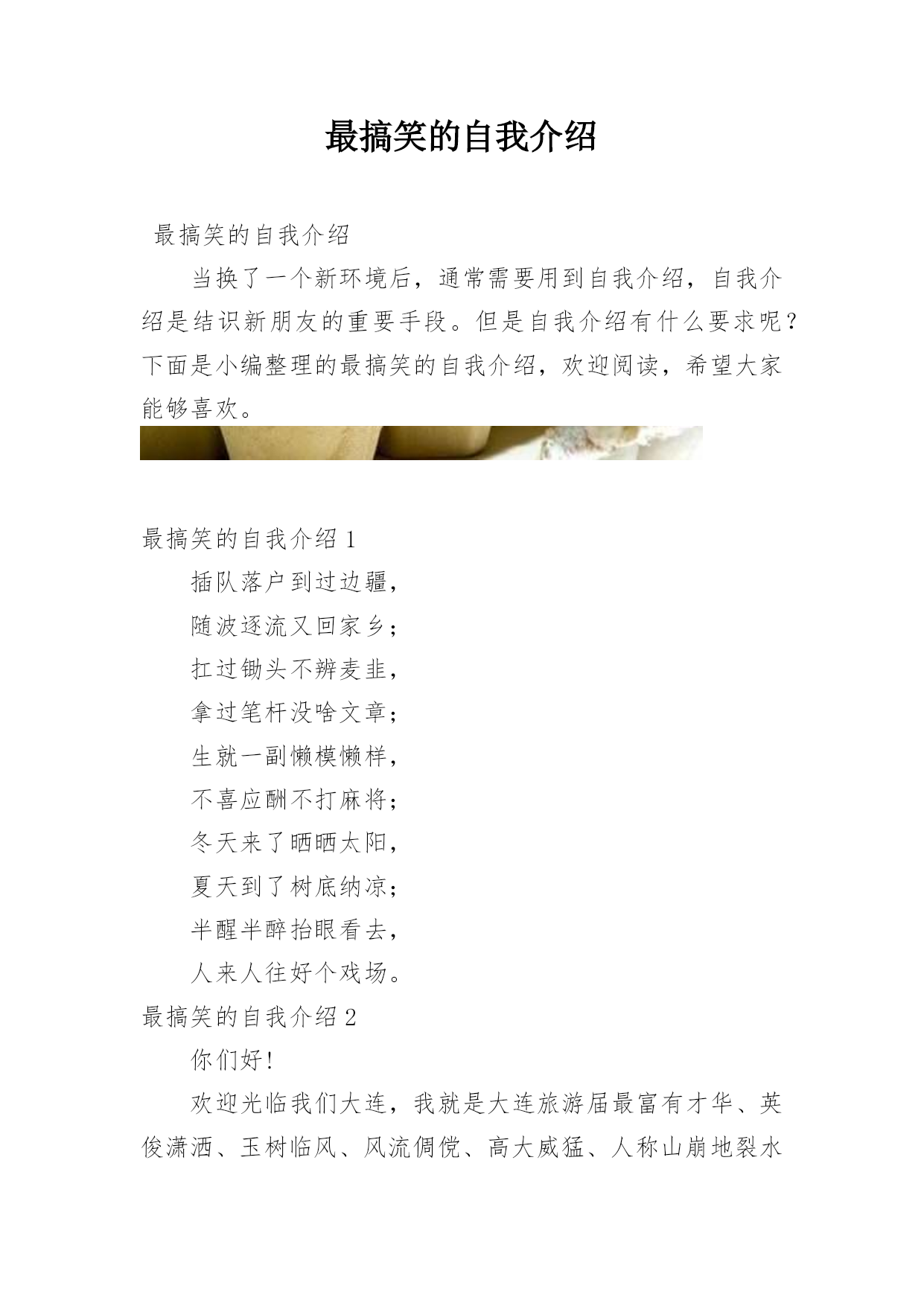最搞笑的自我介绍最搞笑的自我介绍当换了一个新环境后,通常需要用到自我介绍,自我介绍是结识新朋友的重要手段。但是自我介绍有什么要求呢?下面是小编整理的最搞笑的自我介绍,欢迎阅读,希望大家能够喜欢。最搞笑的自我介绍1插队落户到过边疆,随波逐流又回家乡;扛过锄头不辨麦韭,拿过笔杆没啥文章;生就一副懒模懒样,不喜应酬不打麻将;冬天来了晒晒太阳,夏天到了树底纳凉;半醒半醉抬眼看去,人来人往好个戏场。最搞笑的自我介绍2你们好!欢迎光临我们大连,我就是大连旅游届最富有才华、英俊潇洒、玉树临风、风流倜傥、高大威猛、人称山