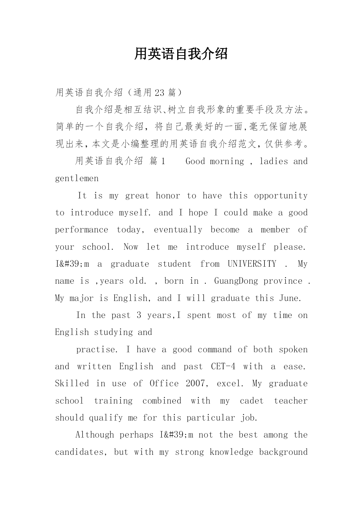 用英语自我介绍用英语自我介绍(通用23篇)自我介绍是相互结识、树立自我形象的重要手段及方法。简单的一个自我介绍,将自己最美好的一面,毫无保留地展现出来,本文是小编整理的用英语自我介绍范文,仅供参考。用英语自我介绍篇1Goodmorning,ladiesandgentlemenItismygreathonortohavethisopportunitytointroducemyself.andIhopeIcouldmakeagoodperformancetoday,eventuallybecomeamembe