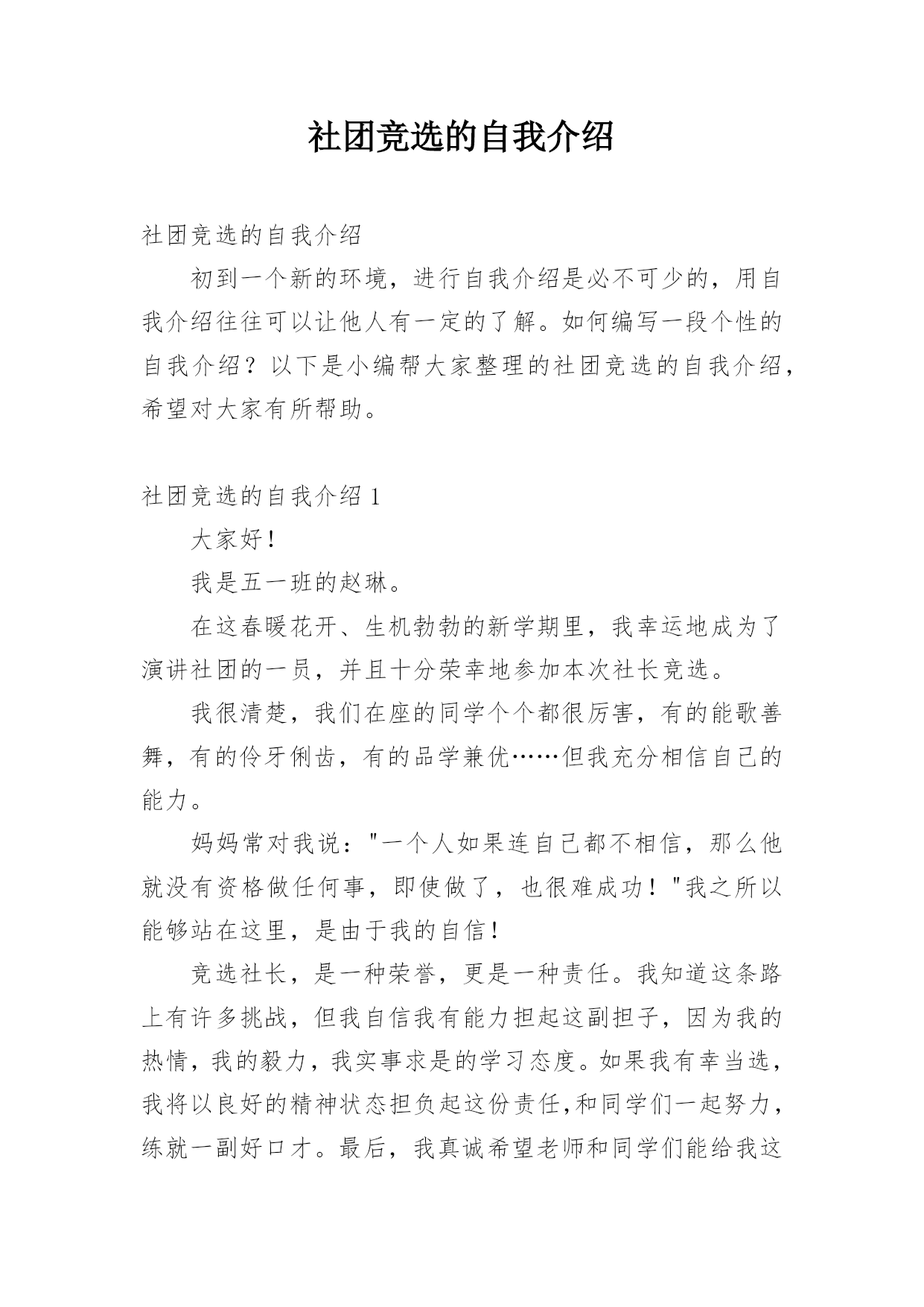 社团竞选的自我介绍社团竞选的自我介绍初到一个新的环境,进行自我介绍是必不可少的,用自我介绍往往可以让他人有一定的了解。如何编写一段个性的自我介绍?以下是小编帮大家整理的社团竞选的自我介绍,希望对大家有所帮助。社团竞选的自我介绍1大家好!我是五一班的赵琳。在这春暖花开、生机勃勃的新学期里,我幸运地成为了演讲社团的一员,并且十分荣幸地参加本次社长竞选。我很清楚,我们在座的同学个个都很厉害,有的能歌善舞,有的伶牙俐齿,有的品学兼优……但我充分相信自己的能力。妈妈常对我说:"一个人如果连自己都不相信,那么他就没有