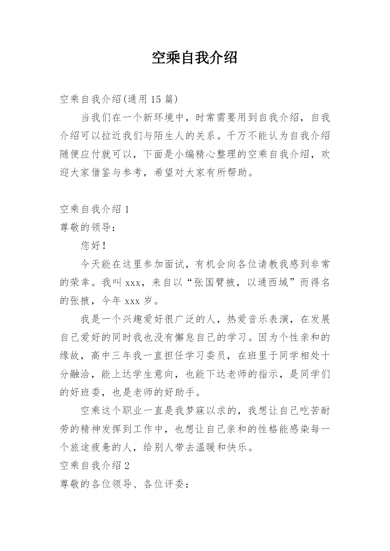 空乘自我介绍空乘自我介绍(通用15篇)当我们在一个新环境中,时常需要用到自我介绍,自我介绍可以拉近我们与陌生人的关系。千万不能认为自我介绍随便应付就可以,下面是小编精心整理的空乘自我介绍,欢迎大家借鉴与参考,希望对大家有所帮助。空乘自我介绍1尊敬的领导:您好!今天能在这里参加面试,有机会向各位请教我感到非常的荣幸。我叫xxx,来自以“张国臂掖,以通西域”而得名的张掖,今年xxx岁。我是一个兴趣爱好很广泛的人,热爱音乐表演,在发展自己爱好的同时我也没有懈怠自己的学习。因为个性亲和的缘故,高中三年我一直担任学