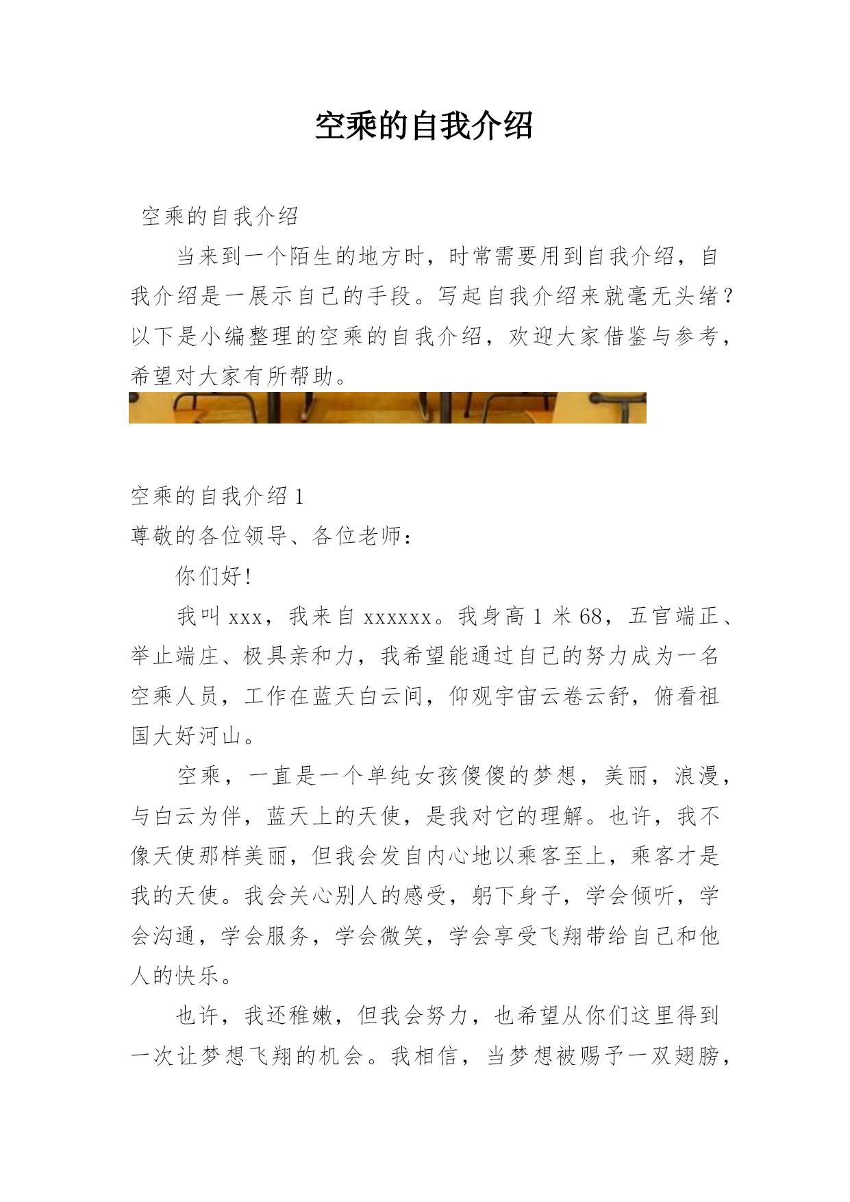空乘的自我介绍空乘的自我介绍当来到一个陌生的地方时,时常需要用到自我介绍,自我介绍是一展示自己的手段。写起自我介绍来就毫无头绪?以下是小编整理的空乘的自我介绍,欢迎大家借鉴与参考,希望对大家有所帮助。空乘的自我介绍1尊敬的各位领导、各位老师:你们好!我叫xxx,我来自xxxxxx。我身高1米68,五官端正、举止端庄、极具亲和力,我希望能通过自己的努力成为一名空乘人员,工作在蓝天白云间,仰观宇宙云卷云舒,俯看祖国大好河山。空乘,一直是一个单纯女孩傻傻的梦想,美丽,浪漫,与白云为伴,蓝天上的天使,是我对它的理