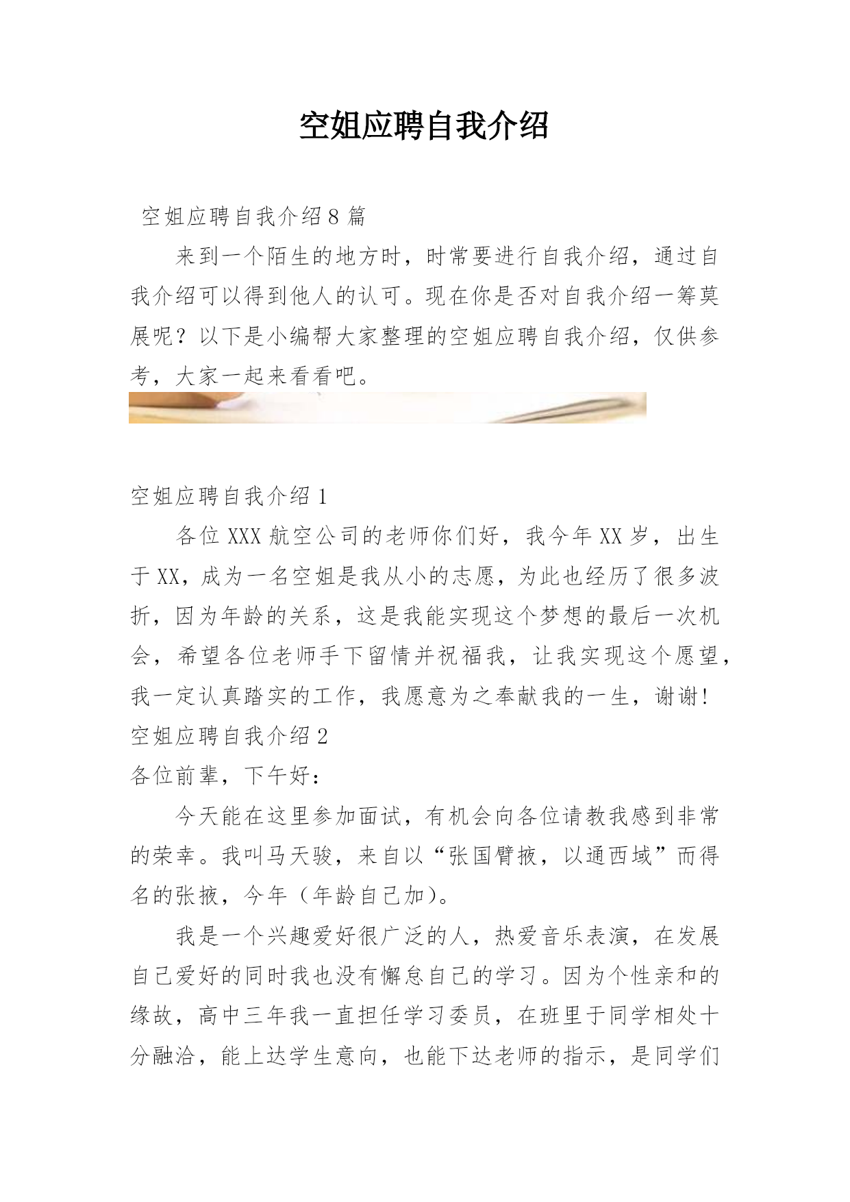 空姐应聘自我介绍空姐应聘自我介绍8篇来到一个陌生的地方时,时常要进行自我介绍,通过自我介绍可以得到他人的认可。现在你是否对自我介绍一筹莫展呢?以下是小编帮大家整理的空姐应聘自我介绍,仅供参考,大家一起来看看吧。空姐应聘自我介绍1各位XXX航空公司的老师你们好,我今年XX岁,出生于XX,成为一名空姐是我从小的志愿,为此也经历了很多波折,因为年龄的关系,这是我能实现这个梦想的最后一次机会,希望各位老师手下留情并祝福我,让我实现这个愿望,我一定认真踏实的工作,我愿意为之奉献我的一生,谢谢!空姐应聘自我介绍2各位