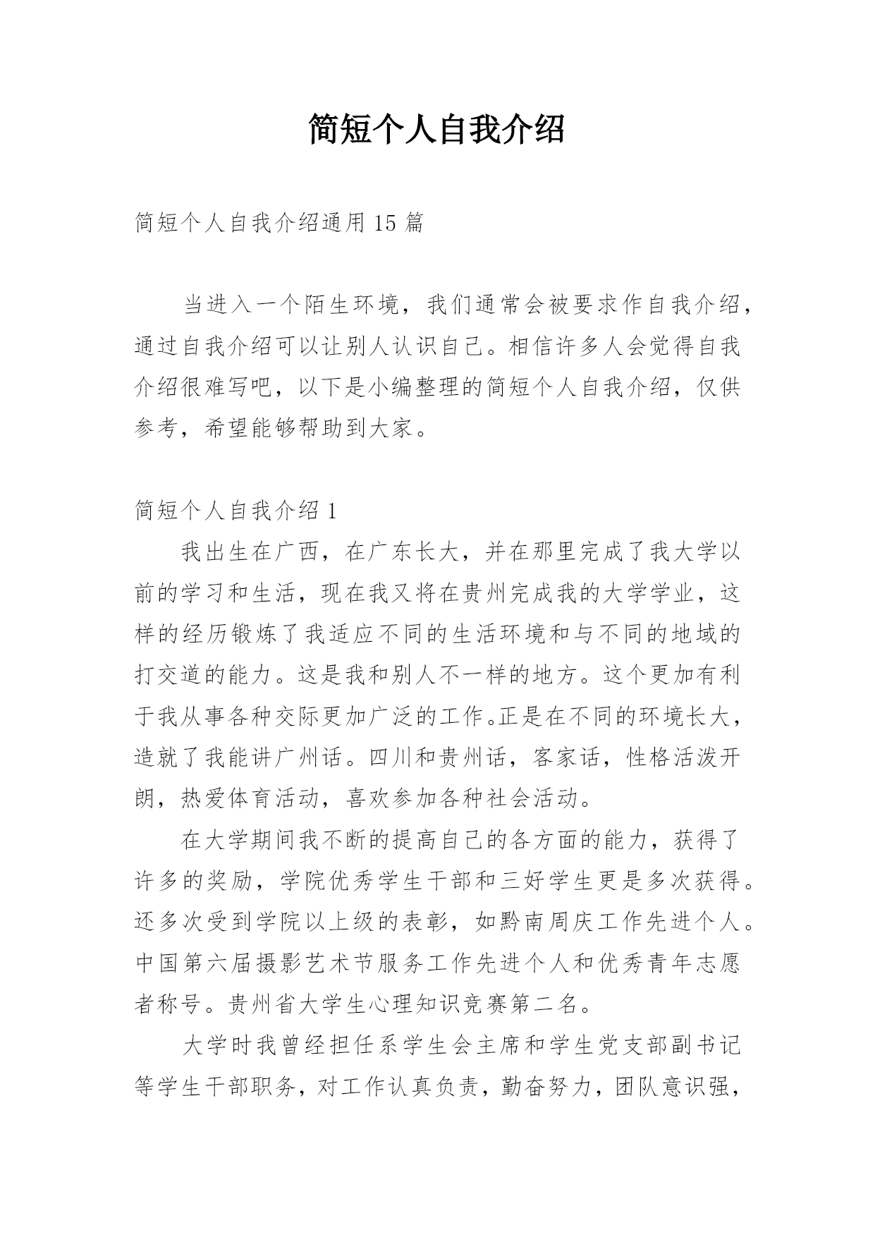 简短个人自我介绍简短个人自我介绍通用15篇当进入一个陌生环境,我们通常会被要求作自我介绍,通过自我介绍可以让别人认识自己。相信许多人会觉得自我介绍很难写吧,以下是小编整理的简短个人自我介绍,仅供参考,希望能够帮助到大家。简短个人自我介绍1我出生在广西,在广东长大,并在那里完成了我大学以前的学习和生活,现在我又将在贵州完成我的大学学业,这样的经历锻炼了我适应不同的生活环境和与不同的地域的打交道的能力。这是我和别人不一样的地方。这个更加有利于我从事各种交际更加广泛的工作。正是在不同的环境长大,造就了我能讲广州