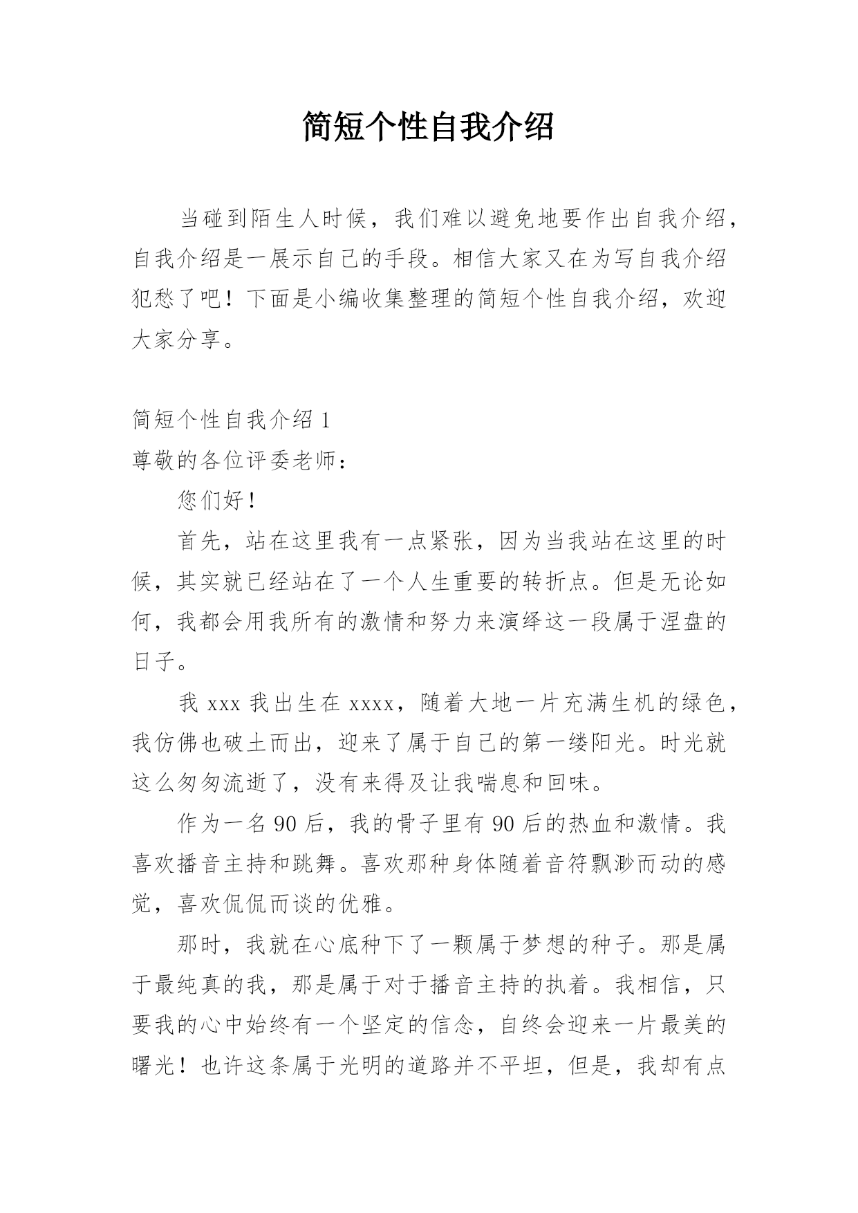 简短个性自我介绍当碰到陌生人时候,我们难以避免地要作出自我介绍,自我介绍是一展示自己的手段。相信大家又在为写自我介绍犯愁了吧!下面是小编收集整理的简短个性自我介绍,欢迎大家分享。简短个性自我介绍1尊敬的各位评委老师:您们好!首先,站在这里我有一点紧张,因为当我站在这里的时候,其实就已经站在了一个人生重要的转折点。但是无论如何,我都会用我所有的激情和努力来演绎这一段属于涅盘的日子。我xxx我出生在xxxx,随着大地一片充满生机的绿色,我仿佛也破土而出,迎来了属于自己的第一缕阳光。时光就这么匆匆流逝了,没有来