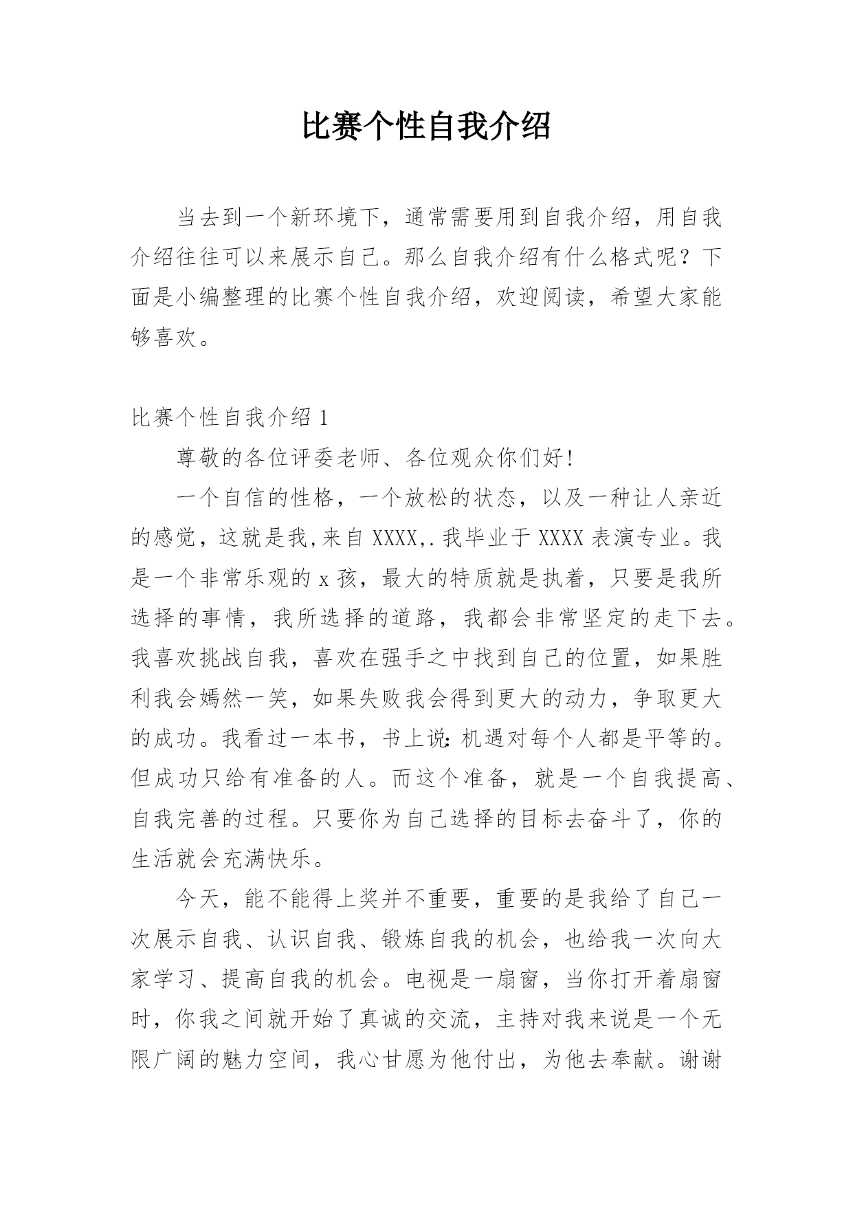 比赛个性自我介绍当去到一个新环境下,通常需要用到自我介绍,用自我介绍往往可以来展示自己。那么自我介绍有什么格式呢?下面是小编整理的比赛个性自我介绍,欢迎阅读,希望大家能够喜欢。比赛个性自我介绍1尊敬的各位评委老师、各位观众你们好!一个自信的性格,一个放松的状态,以及一种让人亲近的感觉,这就是我,来自XXXX,.我毕业于XXXX表演专业。我是一个非常乐观的x孩,最大的特质就是执着,只要是我所选择的事情,我所选择的道路,我都会非常坚定的走下去。我喜欢挑战自我,喜欢在强手之中找到自己的位置,如果胜利我会嫣然一笑