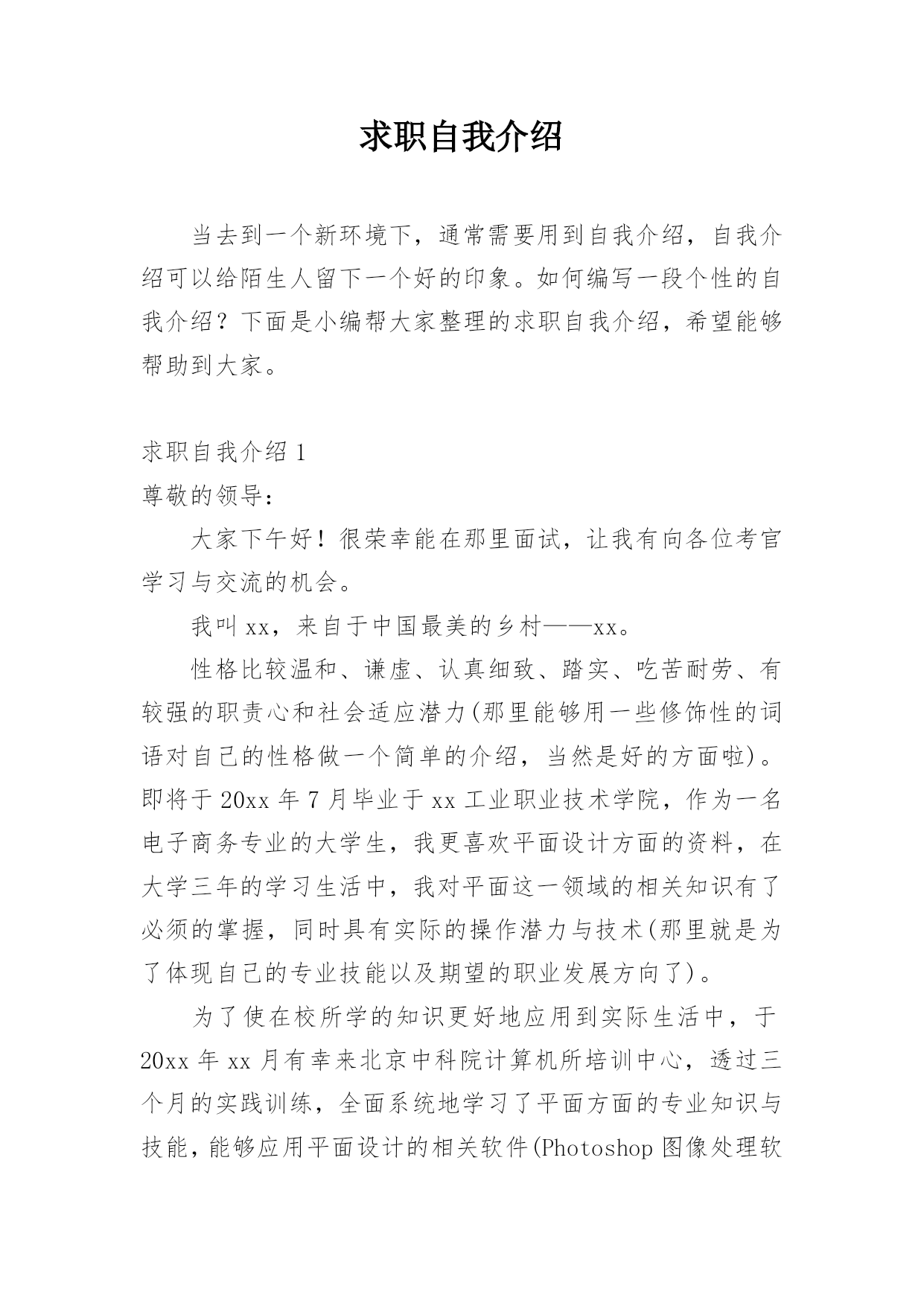 求职自我介绍当去到一个新环境下,通常需要用到自我介绍,自我介绍可以给陌生人留下一个好的印象。如何编写一段个性的自我介绍?下面是小编帮大家整理的求职自我介绍,希望能够帮助到大家。求职自我介绍1尊敬的领导:大家下午好!很荣幸能在那里面试,让我有向各位考官学习与交流的机会。我叫xx,来自于中国最美的乡村——xx。性格比较温和、谦虚、认真细致、踏实、吃苦耐劳、有较强的职责心和社会适应潜力(那里能够用一些修饰性的词语对自己的性格做一个简单的介绍,当然是好的方面啦)。即将于20xx年7月毕业于xx工业职业技术学院,作