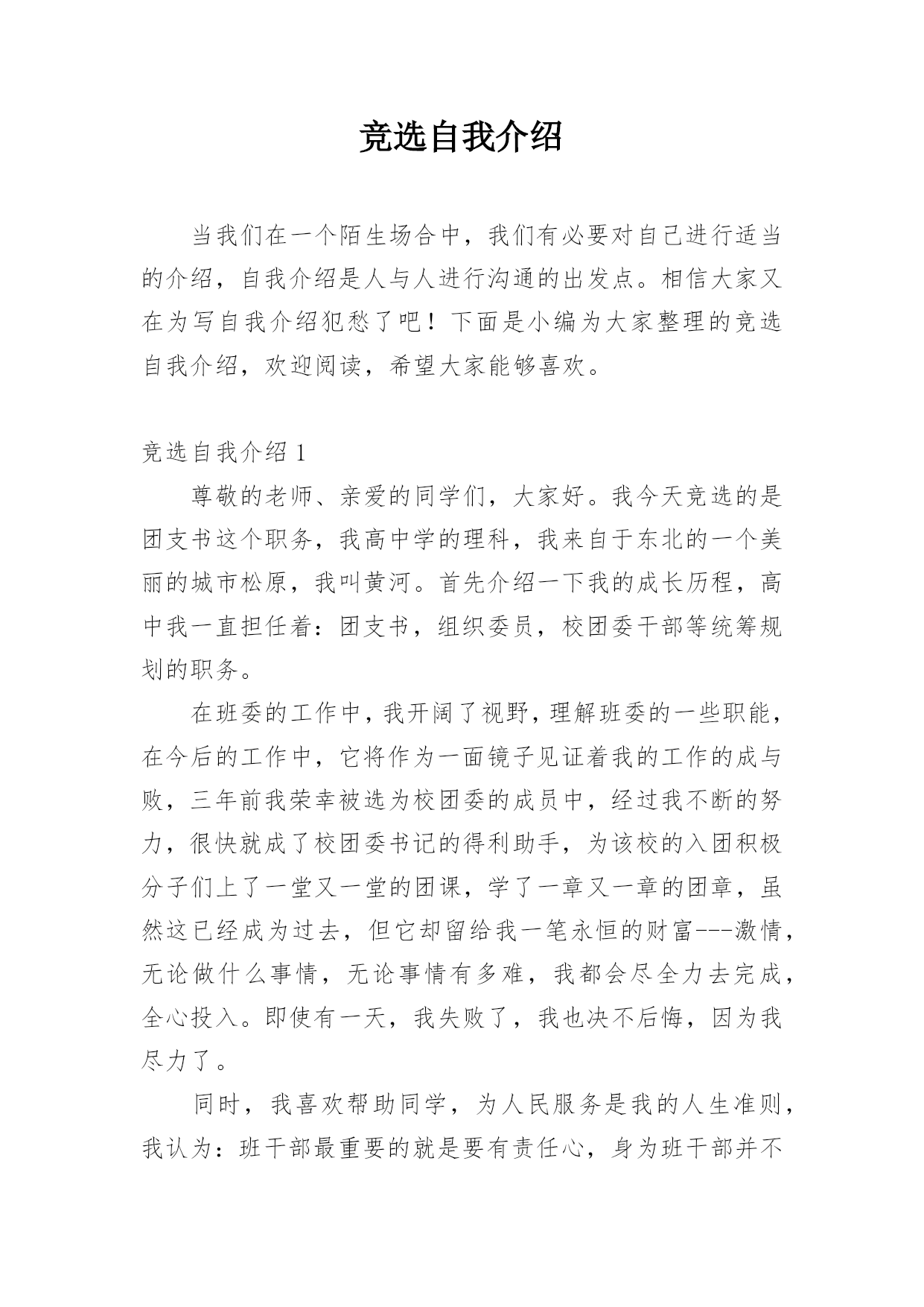 竞选自我介绍当我们在一个陌生场合中,我们有必要对自己进行适当的介绍,自我介绍是人与人进行沟通的出发点。相信大家又在为写自我介绍犯愁了吧!下面是小编为大家整理的竞选自我介绍,欢迎阅读,希望大家能够喜欢。竞选自我介绍1尊敬的老师、亲爱的同学们,大家好。我今天竞选的是团支书这个职务,我高中学的理科,我来自于东北的一个美丽的城市松原,我叫黄河。首先介绍一下我的成长历程,高中我一直担任着:团支书,组织委员,校团委干部等统筹规划的职务。在班委的工作中,我开阔了视野,理解班委的一些职能,在今后的工作中,它将作为一面镜子