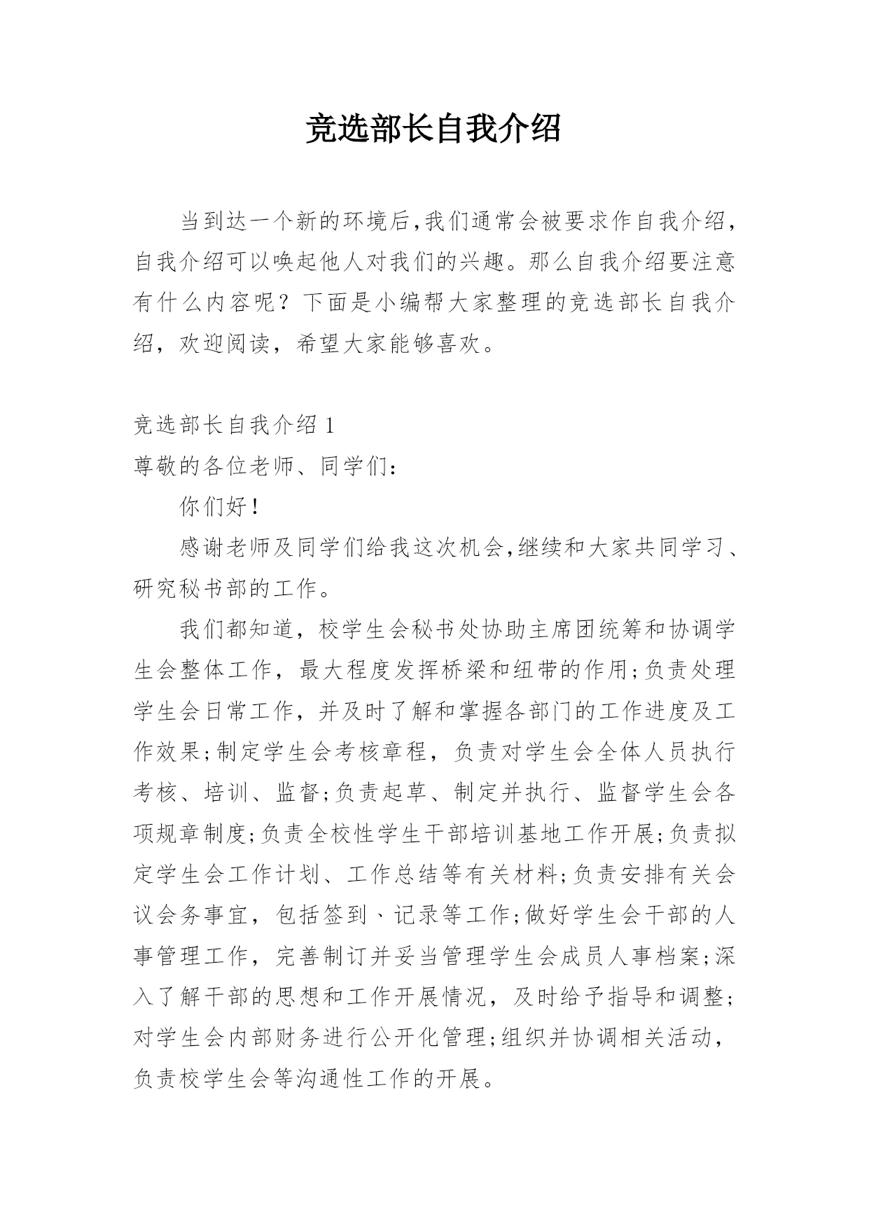 竞选部长自我介绍当到达一个新的环境后,我们通常会被要求作自我介绍,自我介绍可以唤起他人对我们的兴趣。那么自我介绍要注意有什么内容呢?下面是小编帮大家整理的竞选部长自我介绍,欢迎阅读,希望大家能够喜欢。竞选部长自我介绍1尊敬的各位老师、同学们:你们好!感谢老师及同学们给我这次机会,继续和大家共同学习、研究秘书部的工作。我们都知道,校学生会秘书处协助主席团统筹和协调学生会整体工作,最大程度发挥桥梁和纽带的作用;负责处理学生会日常工作,并及时了解和掌握各部门的工作进度及工作效果;制定学生会考核章程,负责对学生会