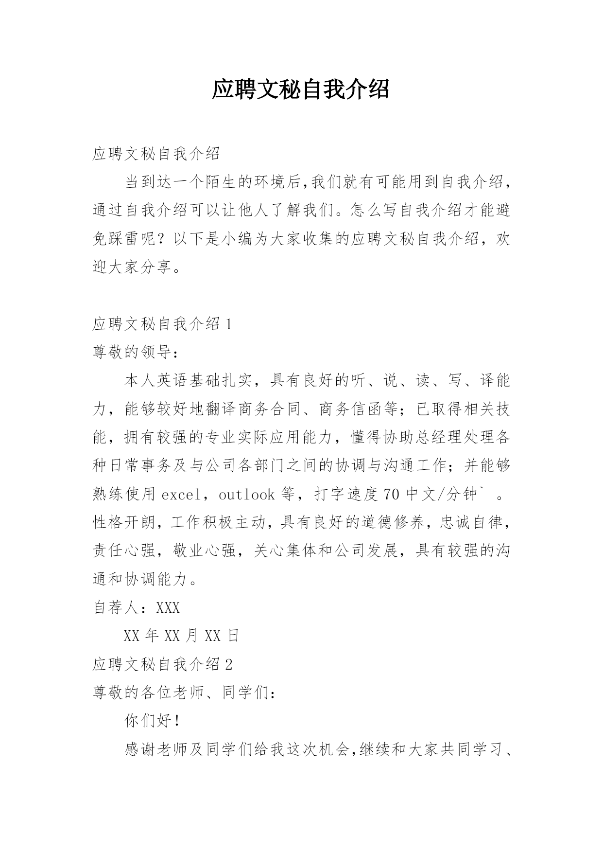 应聘文秘自我介绍应聘文秘自我介绍当到达一个陌生的环境后,我们就有可能用到自我介绍,通过自我介绍可以让他人了解我们。怎么写自我介绍才能避免踩雷呢?以下是小编为大家收集的应聘文秘自我介绍,欢迎大家分享。应聘文秘自我介绍1尊敬的领导:本人英语基础扎实,具有良好的听、说、读、写、译能力,能够较好地翻译商务合同、商务信函等;已取得相关技能,拥有较强的专业实际应用能力,懂得协助总经理处理各种日常事务及与公司各部门之间的协调与沟通工作;并能够熟练使用excel,outlook等,打字速度70中文/分钟`。性格开朗,工作