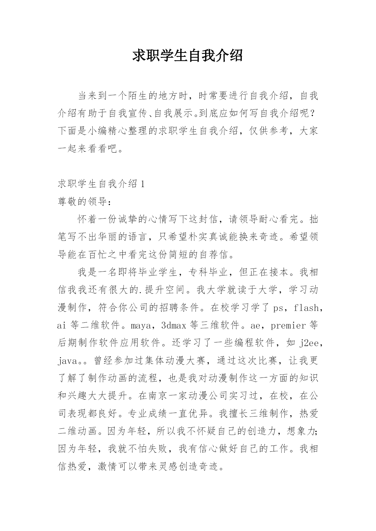 求职学生自我介绍当来到一个陌生的地方时,时常要进行自我介绍,自我介绍有助于自我宣传、自我展示。到底应如何写自我介绍呢?下面是小编精心整理的求职学生自我介绍,仅供参考,大家一起来看看吧。求职学生自我介绍1尊敬的领导:怀着一份诚挚的心情写下这封信,请领导耐心看完。拙笔写不出华丽的语言,只希望朴实真诚能换来奇迹。希望领导能在百忙之中看完这份简短的自荐信。我是一名即将毕业学生,专科毕业,但正在接本。我相信我我还有很大的.提升空间。我大学就读于大学,学习动漫制作,符合你公司的招聘条件。在校学习学了ps,flash,