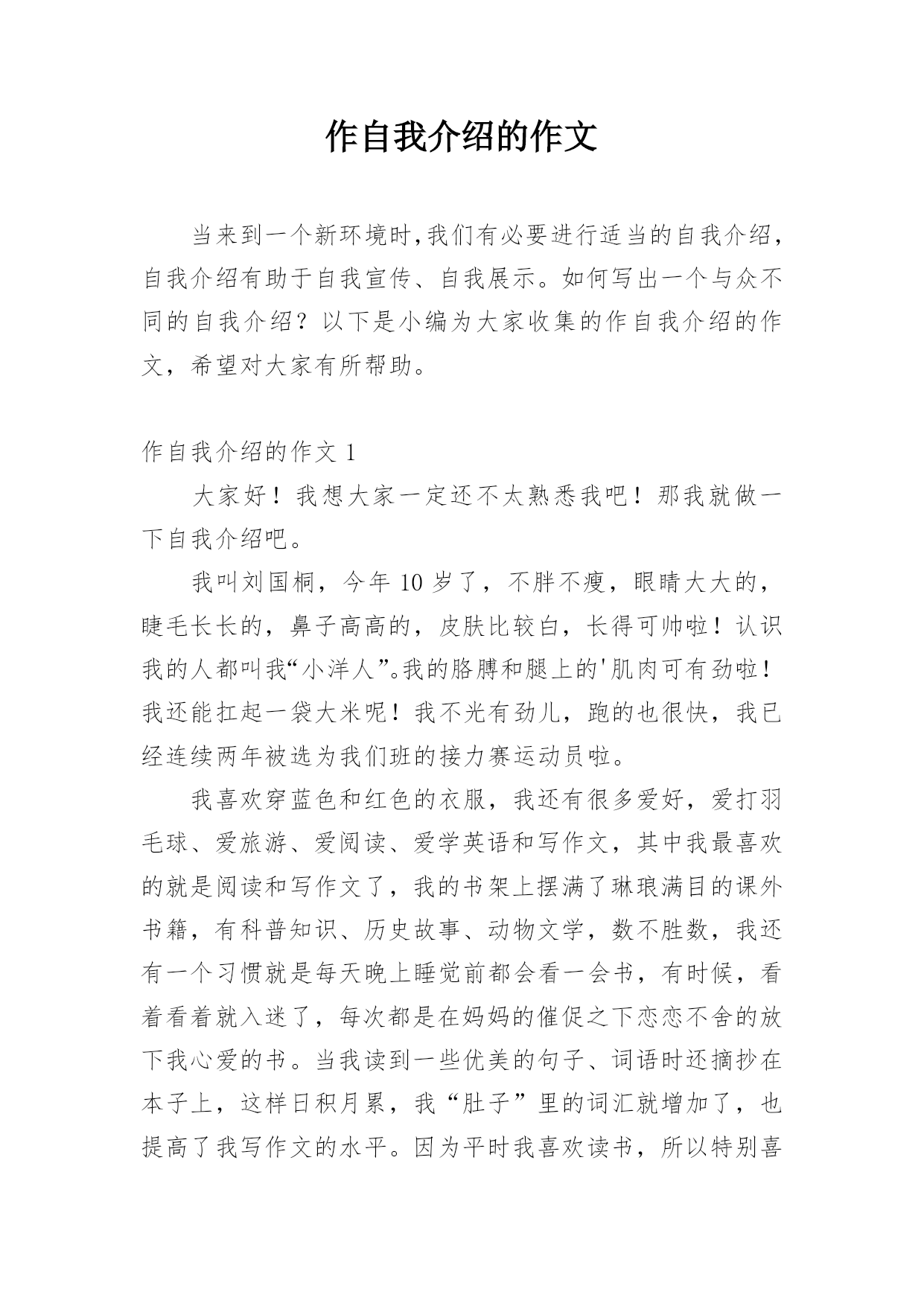 作自我介绍的作文当来到一个新环境时,我们有必要进行适当的自我介绍,自我介绍有助于自我宣传、自我展示。如何写出一个与众不同的自我介绍?以下是小编为大家收集的作自我介绍的作文,希望对大家有所帮助。作自我介绍的作文1大家好!我想大家一定还不太熟悉我吧!那我就做一下自我介绍吧。我叫刘国桐,今年10岁了,不胖不瘦,眼睛大大的,睫毛长长的,鼻子高高的,皮肤比较白,长得可帅啦!认识我的人都叫我“小洋人”。我的胳膊和腿上的'肌肉可有劲啦!我还能扛起一袋大米呢!我不光有劲儿,跑的也很快,我已经连续两年被选为我们班的接力赛运