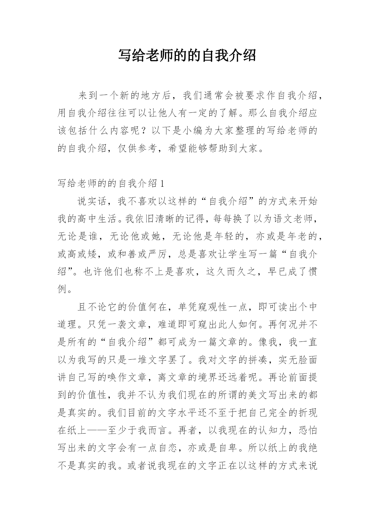 写给老师的的自我介绍来到一个新的地方后,我们通常会被要求作自我介绍,用自我介绍往往可以让他人有一定的了解。那么自我介绍应该包括什么内容呢?以下是小编为大家整理的写给老师的的自我介绍,仅供参考,希望能够帮助到大家。写给老师的的自我介绍1说实话,我不喜欢以这样的“自我介绍”的方式来开始我的高中生活。我依旧清晰的记得,每每换了以为语文老师,无论是谁,无论他或她,无论他是年轻的,亦或是年老的,或高或矮,或和善或严厉,总是喜欢让学生写一篇“自我介绍”。也许他们也称不上是喜欢,这久而久之,早已成了惯例。且不论它的价值