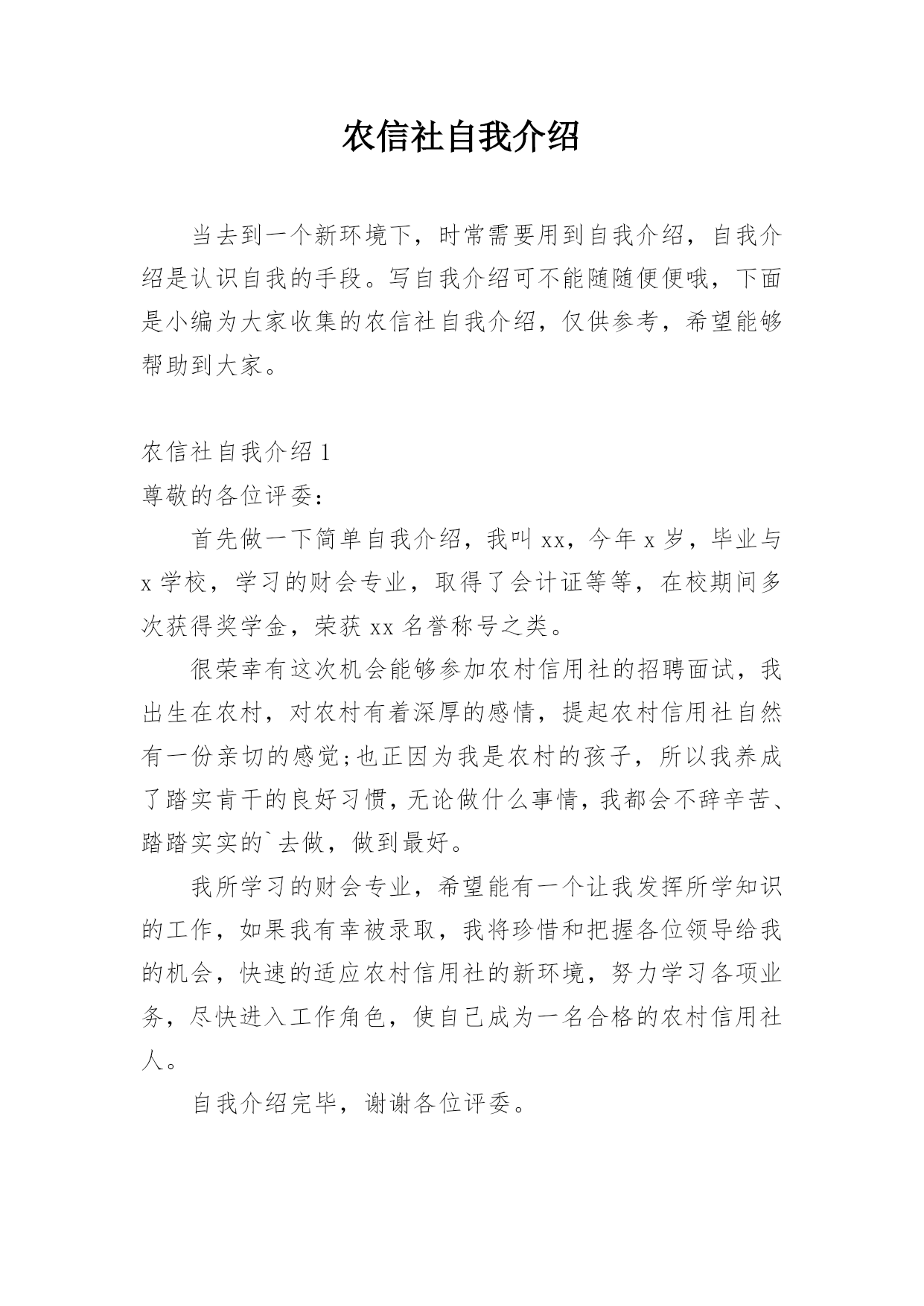 农信社自我介绍当去到一个新环境下,时常需要用到自我介绍,自我介绍是认识自我的手段。写自我介绍可不能随随便便哦,下面是小编为大家收集的农信社自我介绍,仅供参考,希望能够帮助到大家。农信社自我介绍1尊敬的各位评委:首先做一下简单自我介绍,我叫xx,今年x岁,毕业与x学校,学习的财会专业,取得了会计证等等,在校期间多次获得奖学金,荣获xx名誉称号之类。很荣幸有这次机会能够参加农村信用社的招聘面试,我出生在农村,对农村有着深厚的感情,提起农村信用社自然有一份亲切的感觉;也正因为我是农村的孩子,所以我养成了踏实肯干
