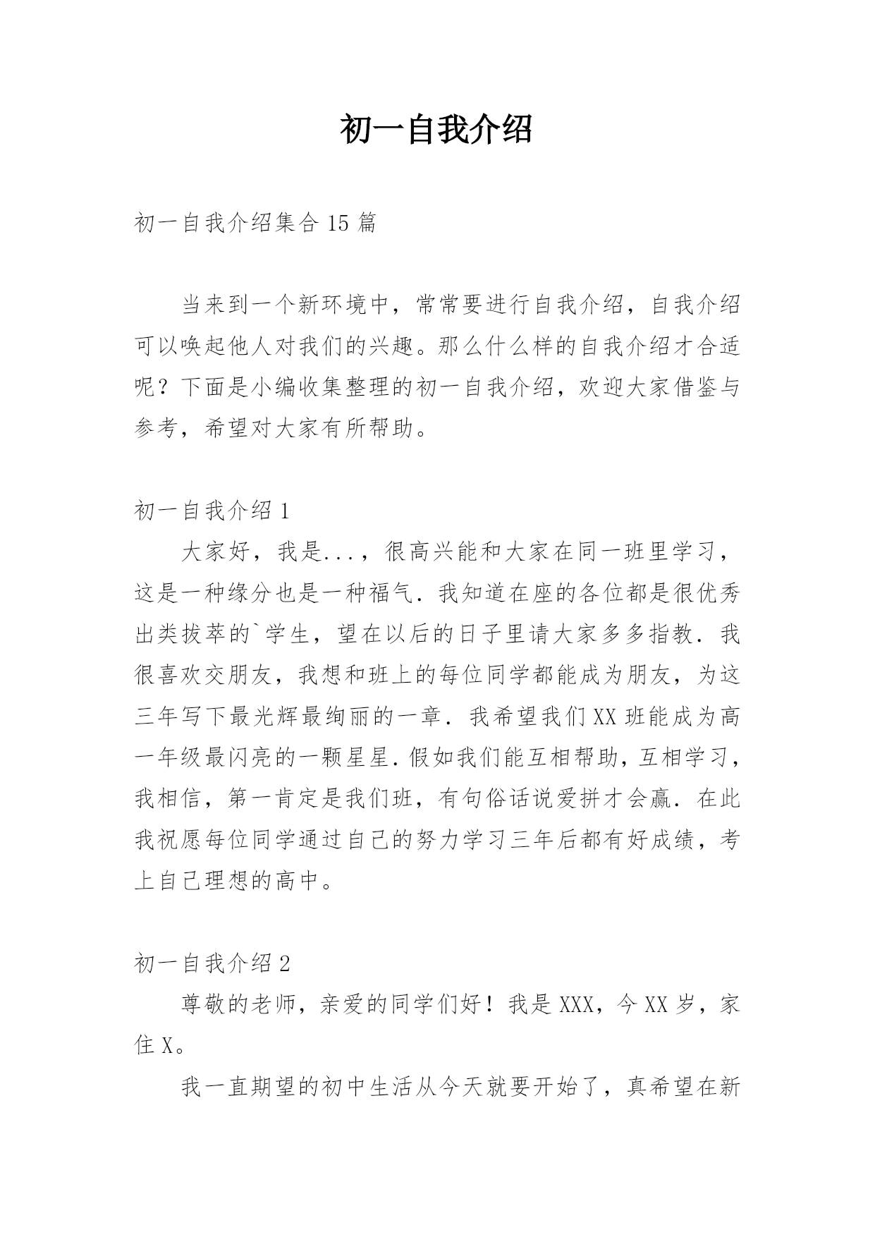 初一自我介绍初一自我介绍集合15篇当来到一个新环境中,常常要进行自我介绍,自我介绍可以唤起他人对我们的兴趣。那么什么样的自我介绍才合适呢?下面是小编收集整理的初一自我介绍,欢迎大家借鉴与参考,希望对大家有所帮助。初一自我介绍1大家好,我是...,很高兴能和大家在同一班里学习,这是一种缘分也是一种福气.我知道在座的各位都是很优秀出类拔萃的`学生,望在以后的日子里请大家多多指教.我很喜欢交朋友,我想和班上的每位同学都能成为朋友,为这三年写下最光辉最绚丽的一章.我希望我们XX班能成为高一年级最闪亮的一颗星星.假