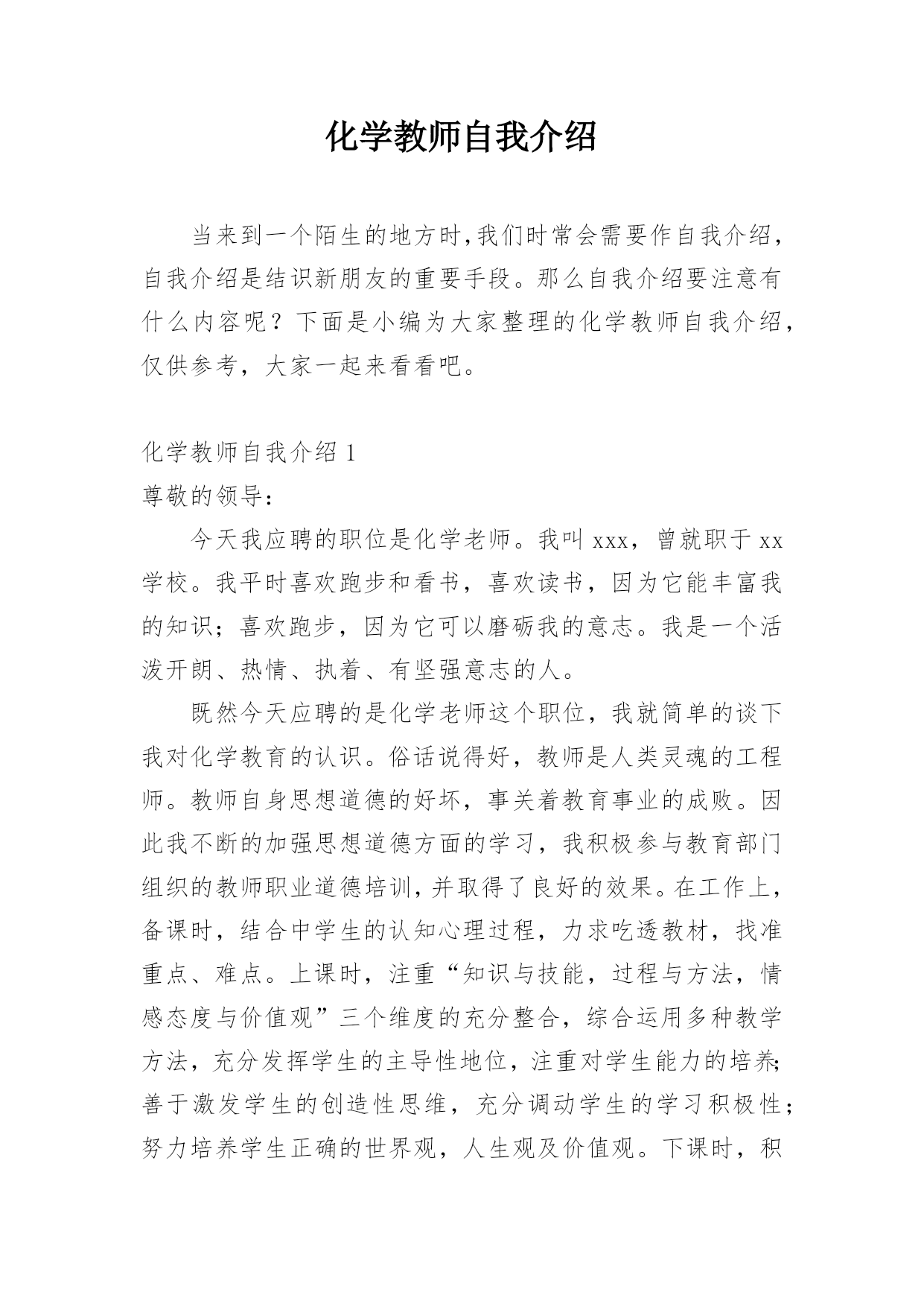 化学教师自我介绍当来到一个陌生的地方时,我们时常会需要作自我介绍,自我介绍是结识新朋友的重要手段。那么自我介绍要注意有什么内容呢?下面是小编为大家整理的化学教师自我介绍,仅供参考,大家一起来看看吧。化学教师自我介绍1尊敬的领导:今天我应聘的职位是化学老师。我叫xxx,曾就职于xx学校。我平时喜欢跑步和看书,喜欢读书,因为它能丰富我的知识;喜欢跑步,因为它可以磨砺我的意志。我是一个活泼开朗、热情、执着、有坚强意志的人。既然今天应聘的是化学老师这个职位,我就简单的谈下我对化学教育的认识。俗话说得好,教师是人类