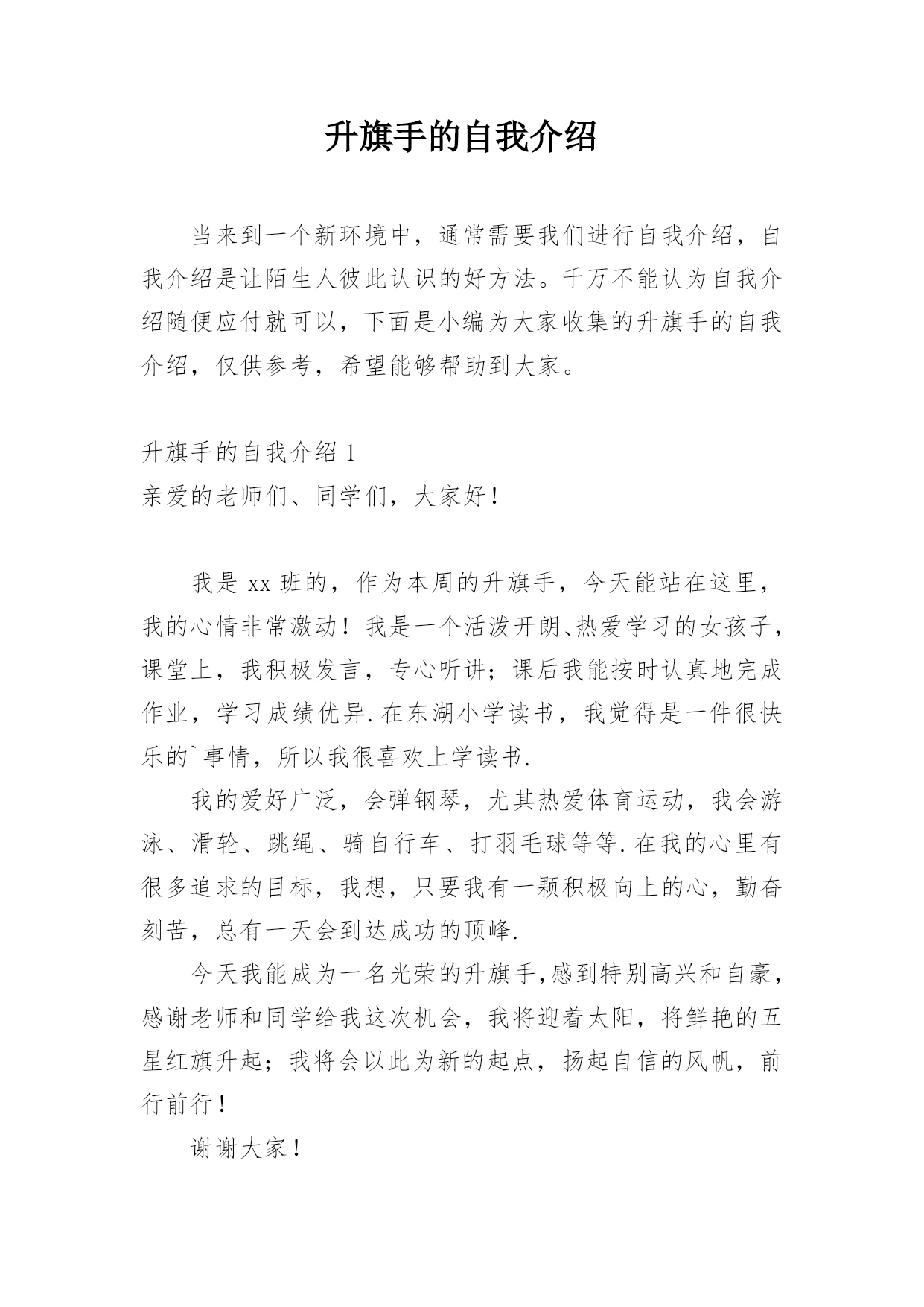 升旗手的自我介绍当来到一个新环境中,通常需要我们进行自我介绍,自我介绍是让陌生人彼此认识的好方法。千万不能认为自我介绍随便应付就可以,下面是小编为大家收集的升旗手的自我介绍,仅供参考,希望能够帮助到大家。升旗手的自我介绍1亲爱的老师们、同学们,大家好!我是xx班的,作为本周的升旗手,今天能站在这里,我的心情非常激动!我是一个活泼开朗、热爱学习的女孩子,课堂上,我积极发言,专心听讲;课后我能按时认真地完成作业,学习成绩优异.在东湖小学读书,我觉得是一件很快乐的`事情,所以我很喜欢上学读书.我的爱好广泛,会弹