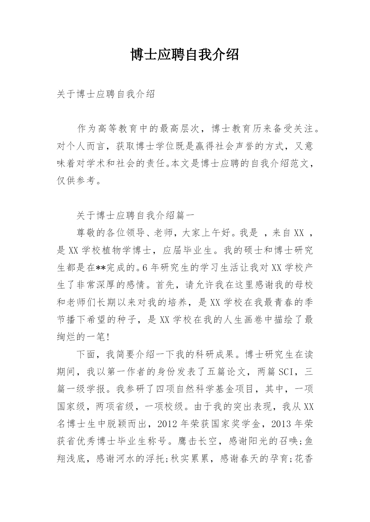 博士应聘自我介绍关于博士应聘自我介绍作为高等教育中的最高层次,博士教育历来备受关注。对个人而言,获取博士学位既是赢得社会声誉的方式,又意味着对学术和社会的责任。本文是博士应聘的自我介绍范文,仅供参考。关于博士应聘自我介绍篇一尊敬的各位领导、老师,大家上午好。我是,来自XX,是XX学校植物学博士,应届毕业生。我的硕士和博士研究生都是在**完成的。6年研究生的学习生活让我对XX学校产生了非常深厚的感情。首先,请允许我在这里感谢我的母校和老师们长期以来对我的培养,是XX学校在我最青春的季节播下希望的种子,是XX