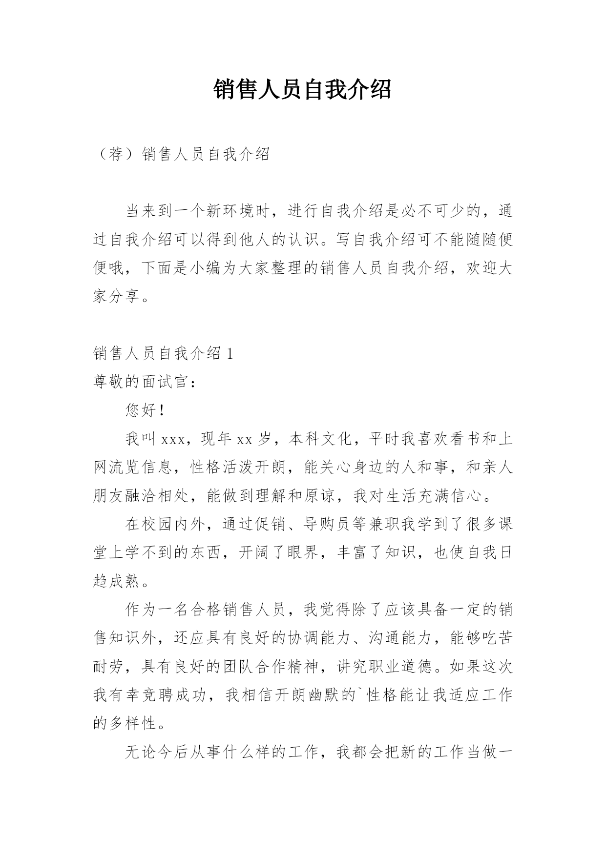 销售人员自我介绍(荐)销售人员自我介绍当来到一个新环境时,进行自我介绍是必不可少的,通过自我介绍可以得到他人的认识。写自我介绍可不能随随便便哦,下面是小编为大家整理的销售人员自我介绍,欢迎大家分享。销售人员自我介绍1尊敬的面试官:您好!我叫xxx,现年xx岁,本科文化,平时我喜欢看书和上网流览信息,性格活泼开朗,能关心身边的人和事,和亲人朋友融洽相处,能做到理解和原谅,我对生活充满信心。在校园内外,通过促销、导购员等兼职我学到了很多课堂上学不到的东西,开阔了眼界,丰富了知识,也使自我日趋成熟。作为一名合格