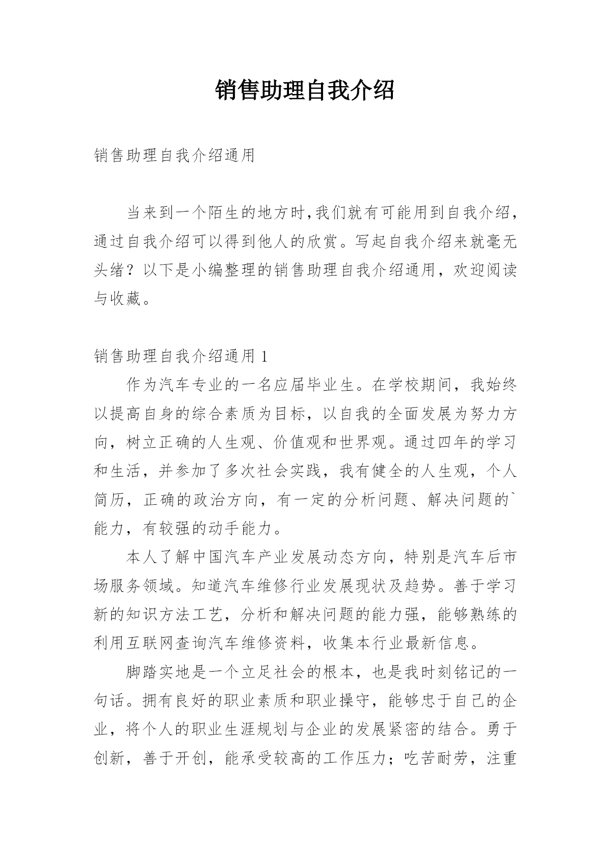 销售助理自我介绍销售助理自我介绍通用当来到一个陌生的地方时,我们就有可能用到自我介绍,通过自我介绍可以得到他人的欣赏。写起自我介绍来就毫无头绪?以下是小编整理的销售助理自我介绍通用,欢迎阅读与收藏。销售助理自我介绍通用1作为汽车专业的一名应届毕业生。在学校期间,我始终以提高自身的综合素质为目标,以自我的全面发展为努力方向,树立正确的人生观、价值观和世界观。通过四年的学习和生活,并参加了多次社会实践,我有健全的人生观,个人简历,正确的政治方向,有一定的分析问题、解决问题的`能力,有较强的动手能力。本人了解中
